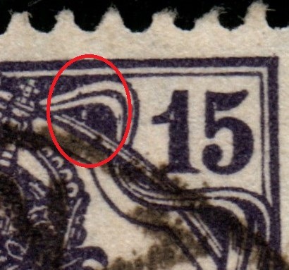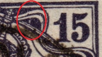 Schließlich noch eine Druckabweichung. Ein farbloser Strich rechts von der Krone.