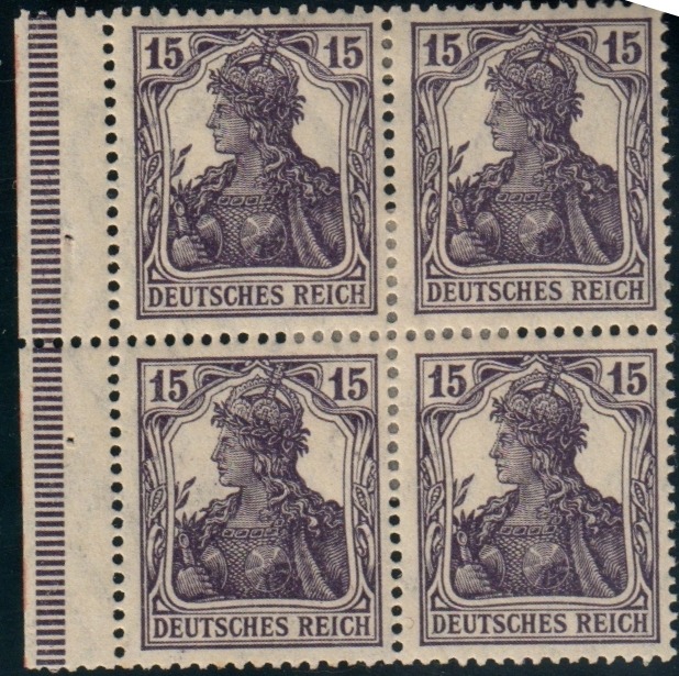 nach nicht mal einem Jahr wurden die bräunlichen 15 Pfg. Germania-Marken durch Marken mit violetter Druckfarbe abgelöst. Laut Kohl-Handbuch gab es Verwechslungen im Funzel-Licht der Postämter mit der orangen 7 1/2 Pfg. Marke.
