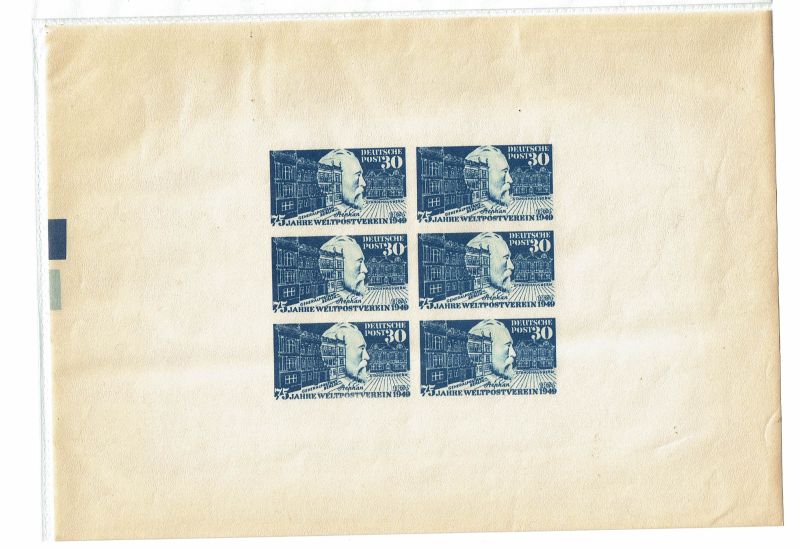 In einem Papiernachlass habe ich diesen Bogen "75 Jahre Weltpostverein" gefunden. Er scheint original zu sein - die Rückseite hat das typische Papier, das man anfeuchten kann, damit es klebt.