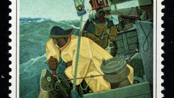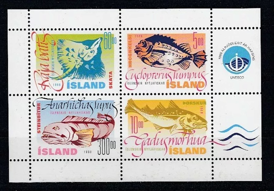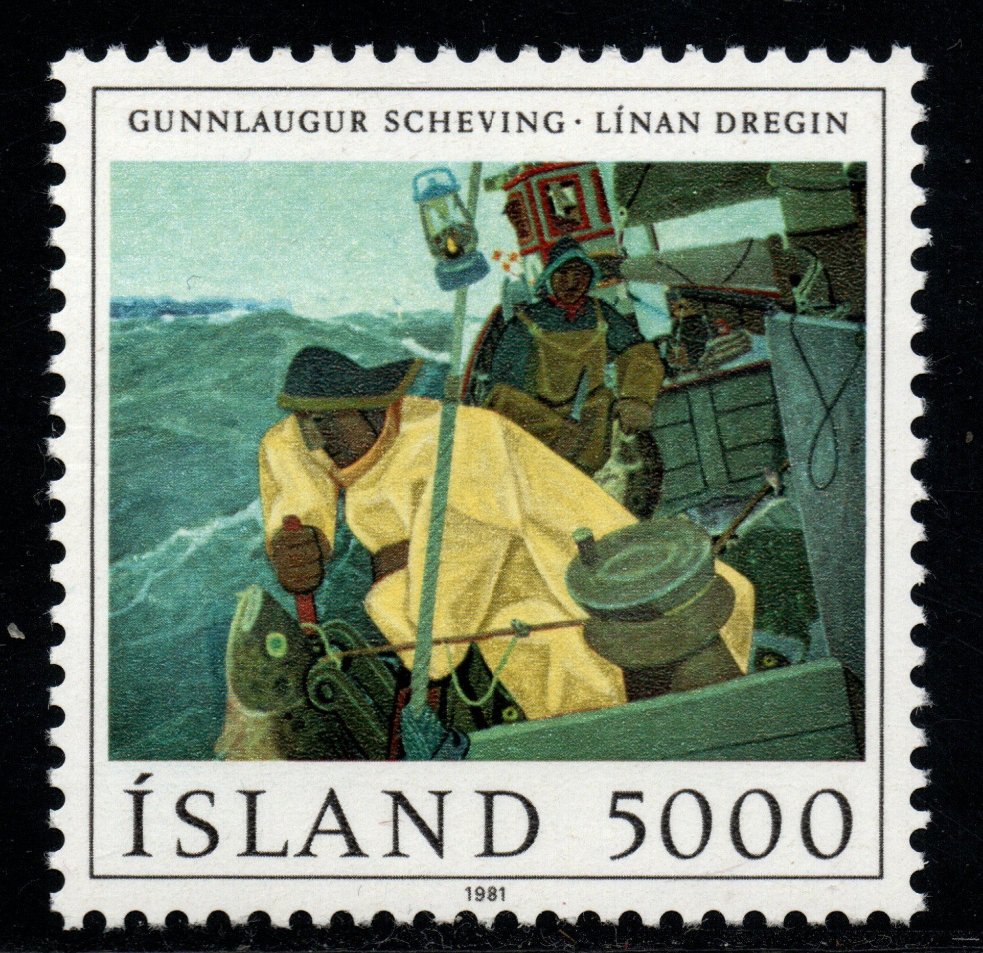 wir bleiben beim Thema Fisch. Am 21. Oktober 1981 brachte die isländische Post mit einem Gemäldemotiv heraus. Das Gemälde von Gunnlaugur Scheving Einholen der Langleine zeigt Fischer auf hoher See. Mit Langleinen werden vor Island unter anderem Kabeljau und Heilbutt gefangen.
