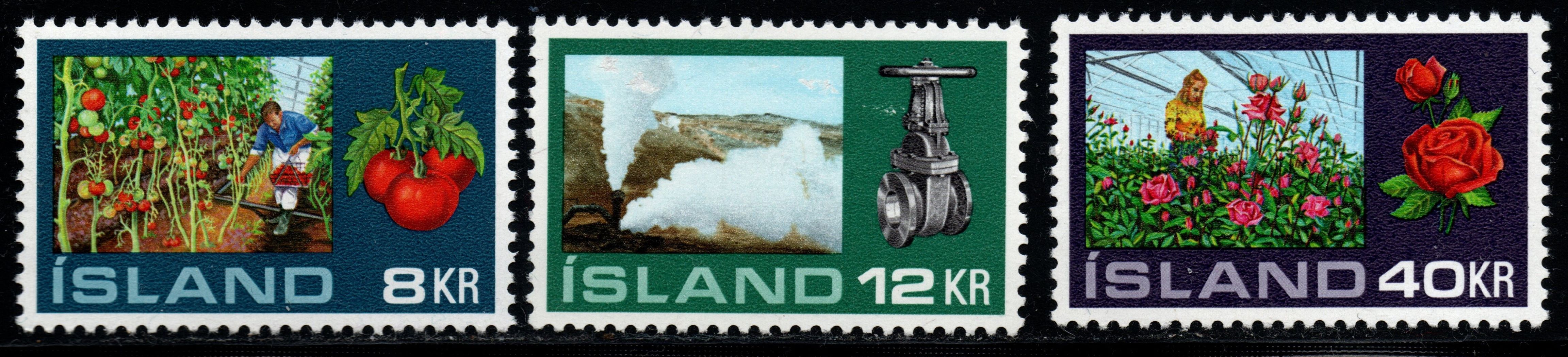 am 23.8.1972 erschien eine drei Werte umfassende Markenausgabe zur Nutzung der Geothermie in der Landwirtschaft. Island gehörte zu den Pionieren der Nutzung der Erdwärme und ermöglichte es isländischen Landwirten Obst, Gemüse und Blumen in Gewächshäusern anzubauern die mit Hilfe der Geothermie beheizt werden.