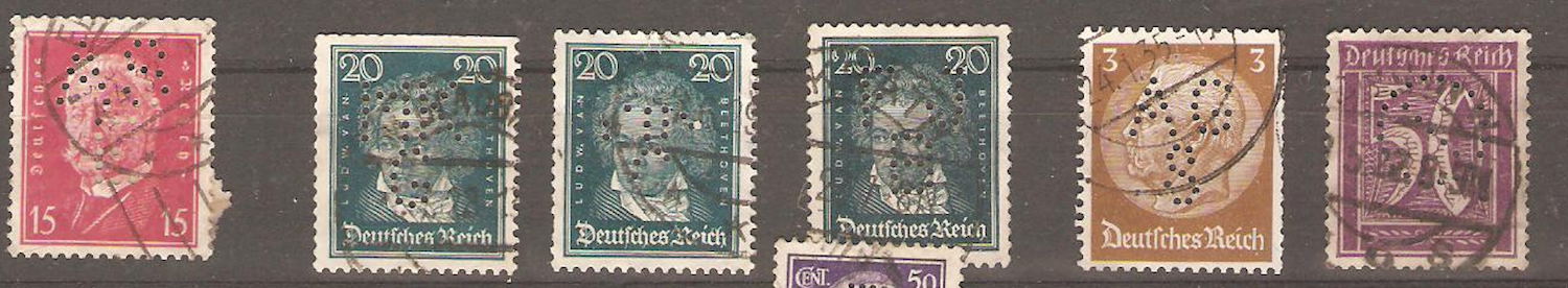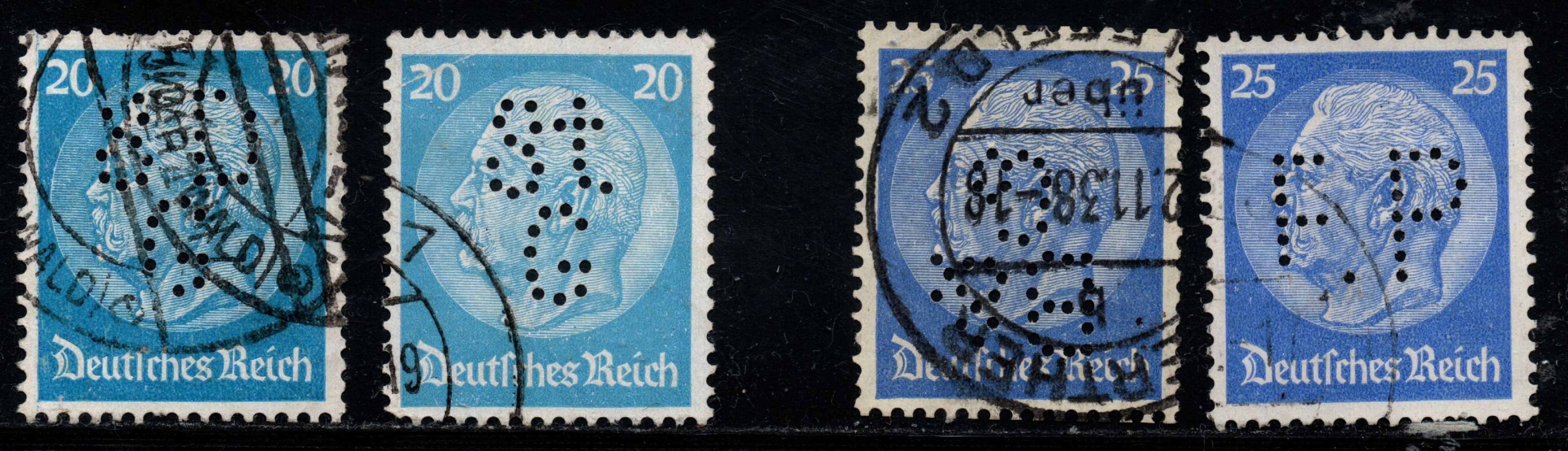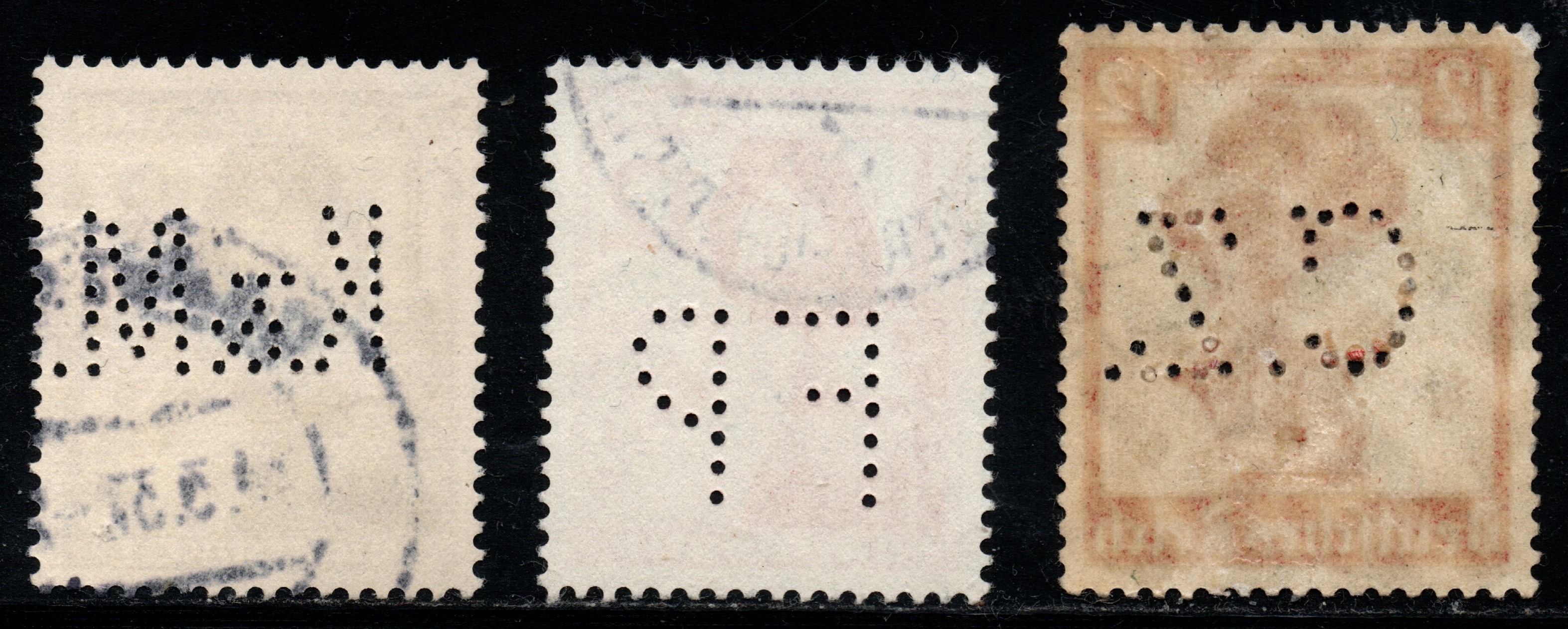 heute kommen die letzten drei Perfins auf Marken der Hindenburgausgabe:
