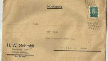 Und dann noch diese schöne Firmenlochung auf einer Drucksache der Metallwarenfabrik H.W.Schmidt Döbeln (Sachsen), Mi: 444. Stempel Berlin vom 4.7.1930.