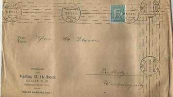 Und Zuletzt ein Geschäftsbrief des Verlages R. Halbeck Berlin mit Perfins auf Mi: 160 vom 29.8.1921. Maschinenstempel waagerecht und senkrecht Berlin W 35 n.