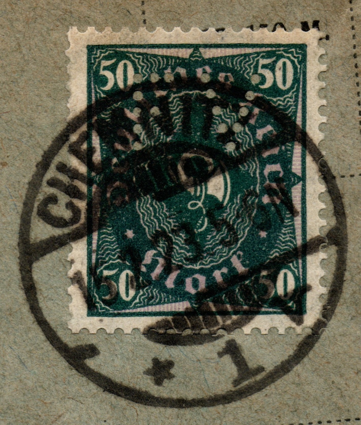 ausnahmsweise mal keine geklaute Abbildung sondern eine Firmenlochung aus der eigenen Sammlung. Eben gerade habe ich eine eingeschriebene Drucksache aus Chemnitz gezeigt. Absender war die Färberei Vereinigung in Chemnitz. Die verklebte 50 Mk. zweifarbige Posthornausgabe weist die Lochung FV = Färberei-Vereinigung auf.
