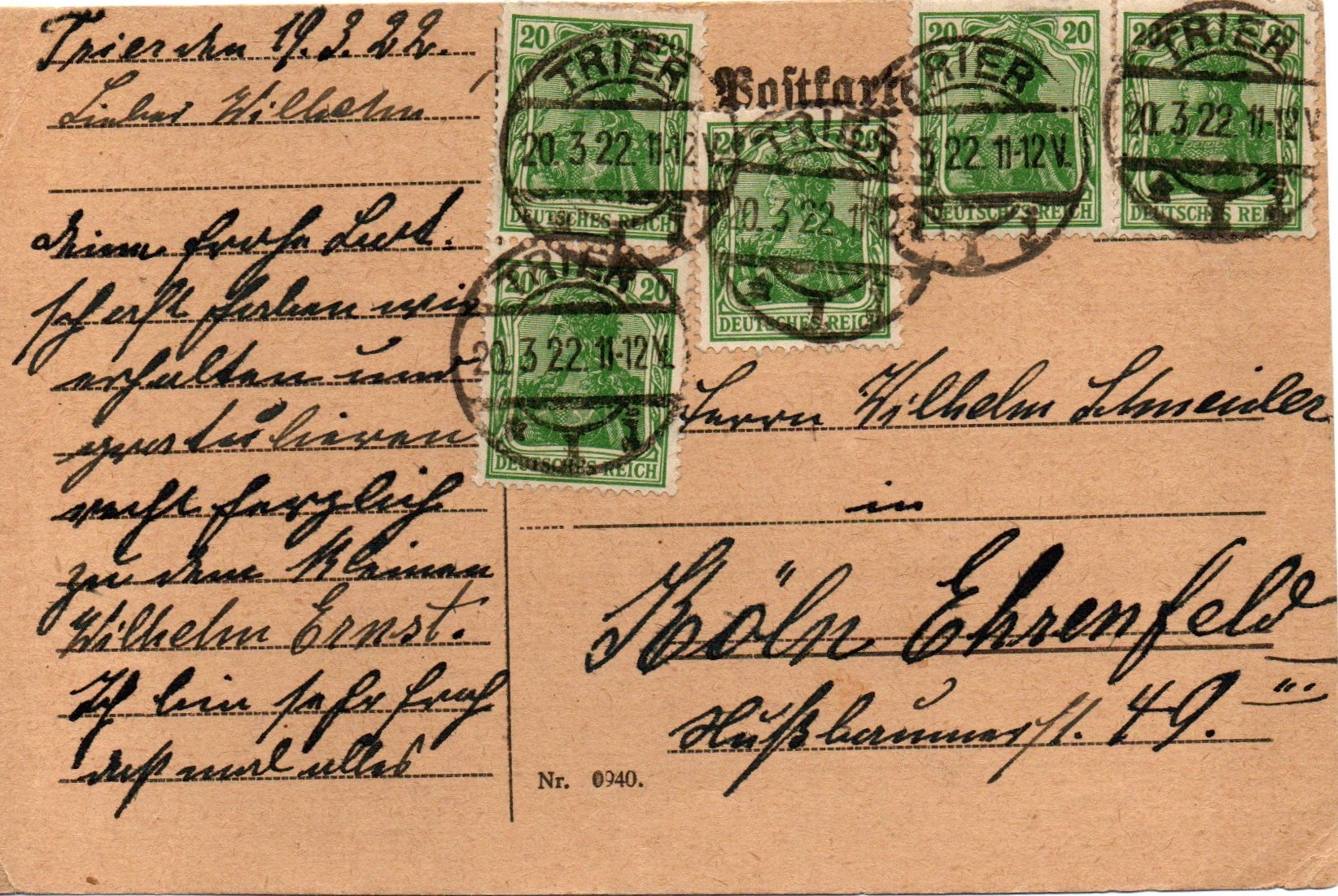 ich habe nur noch eine weitere Mehrfachfrankatur mit geringem philatelistischen Wert denn diese mit fünf 20 Pfg. Marken der Germania VIII-Ausgabe frankierte Inlandspostkarte aus Trier nach Köln vom März 1922, also PP7, ist unterfrankiert aber nicht in Nachporto gesetzt worden. Das korrekte Porto für eine Inlandspostkarte wären seinerzeit 125 Pfg. gewesen. Weder auf der Kartenvorder- noch rückseite sind Spuren einer abgefallenen Marke zu erkennen. Es gab auch keine andere Portoperiode mit einem Postkartenporto i. H. v. 1 Mark.
