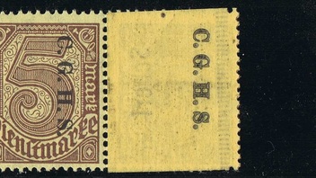 Als Scans ein Beispiel aus dem Abstimmungsgebiet Oberschlesien (1920-1922). Dienst Nr. 20. Die Dienstmarken wurden seinerzeit von der alliierten Abstimmungskommission als Fiskalmarken (und nicht als Briefmarken) betrachtet, weshalb seinerzeit wie andere Fiskalmarken deutschen Ursprungs diese in einer Oppelner Druckerei mit dem Aufdruck "C.G.H.S." ("Commission de Gouvernement de Haute Silésie") versehen wurden. Das Wort "Scherf" auf dem Bogenrand verweist auf den Namen des Druckers der Urmarke Deutsches Reich Dienst Nr. 33.