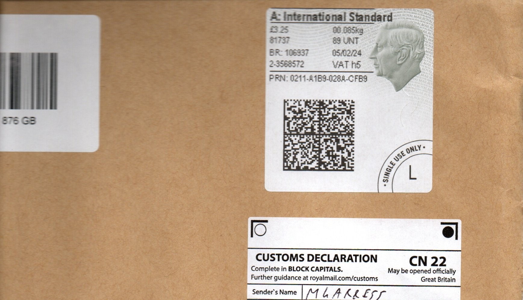 bei den Auslandsbriefen hatte ich mal ein Postage Label mit dem Bildnis Queen Elizabeth II gezeigt. Heute bekam ich aus Großbritannien einen Großbrief mit dem "neuen" Postage Label mit dem Bildnis King Charles II. Post aus UK ist zur Zeit wieder Ewigkeiten unterwegs. Post aus Canada kommt schneller.