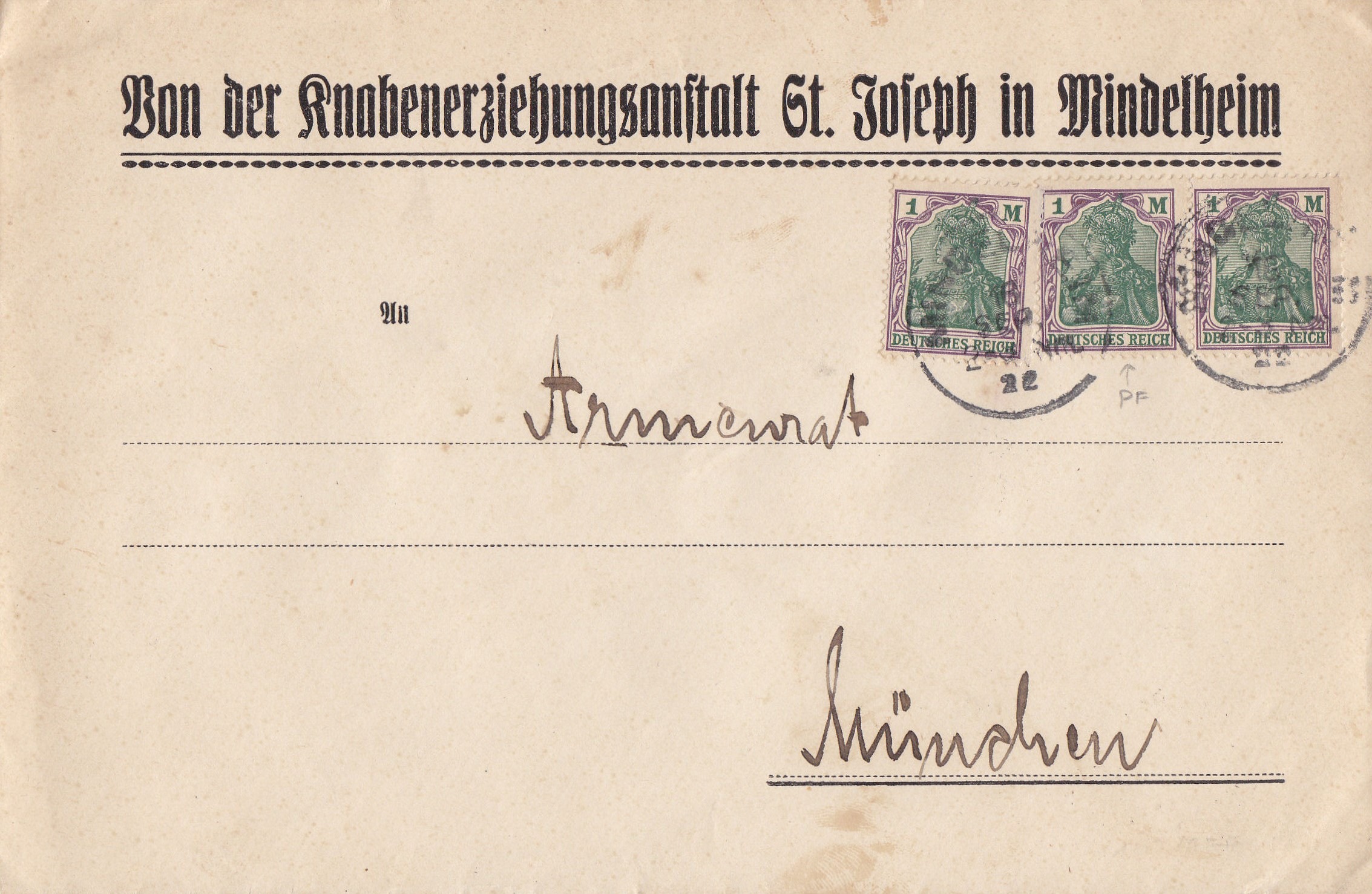 MeF bis 20 Gramm aus der Portoperiode 8. Abgestempelt in Mindelheim am 18.9.22 und adressiert nach München mit der Druckzufälligkeit bei der mittleren Marke.