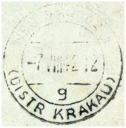 Neu Sandez im Distrikt Krakau war vormals österreichisch gewesen (Galizien). Der Stempel hat noch das österreichische Muster.