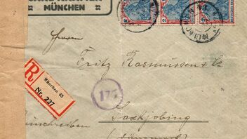 Statt dessen eine Mehrfachfrankatur bestehend aus einem senkrechten Dreierstreifen der 2 Mk. Marke. Die unterste Marke weist übrigens eine Druckabweichung auf, ein blauer Strich im Rahmen oberhalb des D in DEUTSCHES. Ein eingeschriebener Auslandsbrief aus München nach Saxkjöbing in Dänemark vom Januar 1922, also PP7. Auslandsbriefporto 4Mk und Auslandseinschreibegebühr 2 Mk.