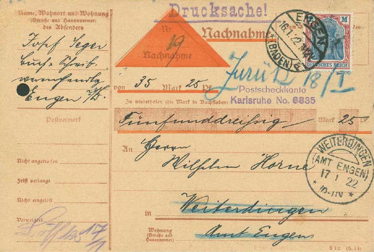 Der Adressat in Weiterdingen verweigerte die Zahlung in Höhe von 35,25 Mark.
