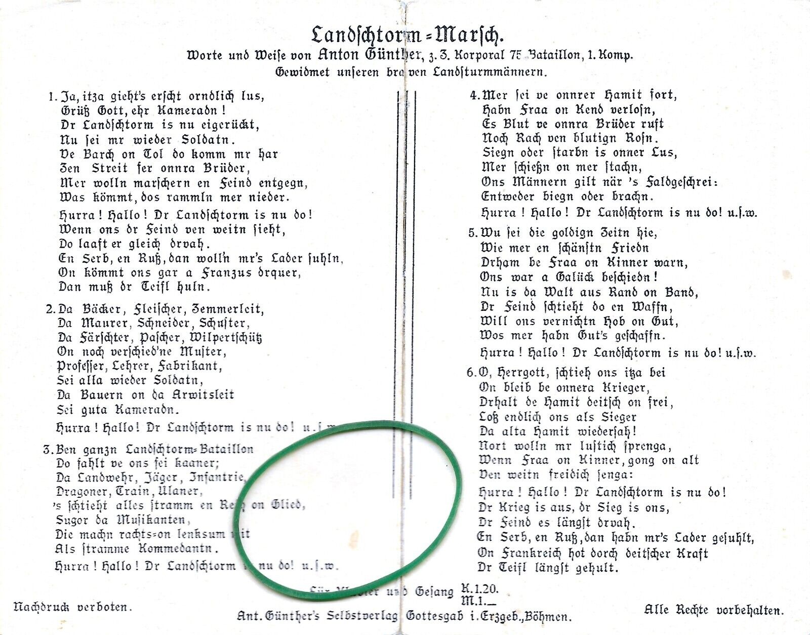 Eine Liederkarte von dem böhmischen Volksdichter und Komponisten Anton Günther aus Gottesgab, nicht gelaufen, mit Abbildung des "Landstorm-Marsches", erzielte am Ende sensationelle 1.160,- EUR, bei einem schon sehr hohen Startpreis von 299,- EUR. Ähnliche Karten haben auch schon in der Vergangenheit öfters so hohe Preise erzielt. Es handelt sich dabei um eine Doppel- oder Klappkarte.