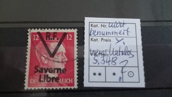 Der Aufdruck auf der ersten Marke ist ein lokaler Aufdruck nach der Befreiung von Saverne (Elsass). Die Marke ist im Yvert verzeichnet. Der Aufdruck auf der zweiten Marke stammt von der ersten französischen Armee und ist nicht in meinem Uralt-Yvert.