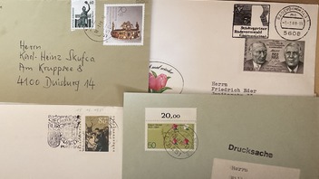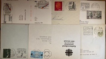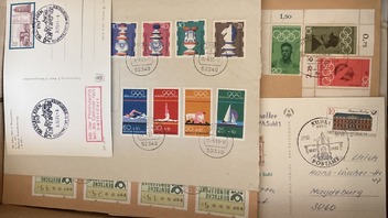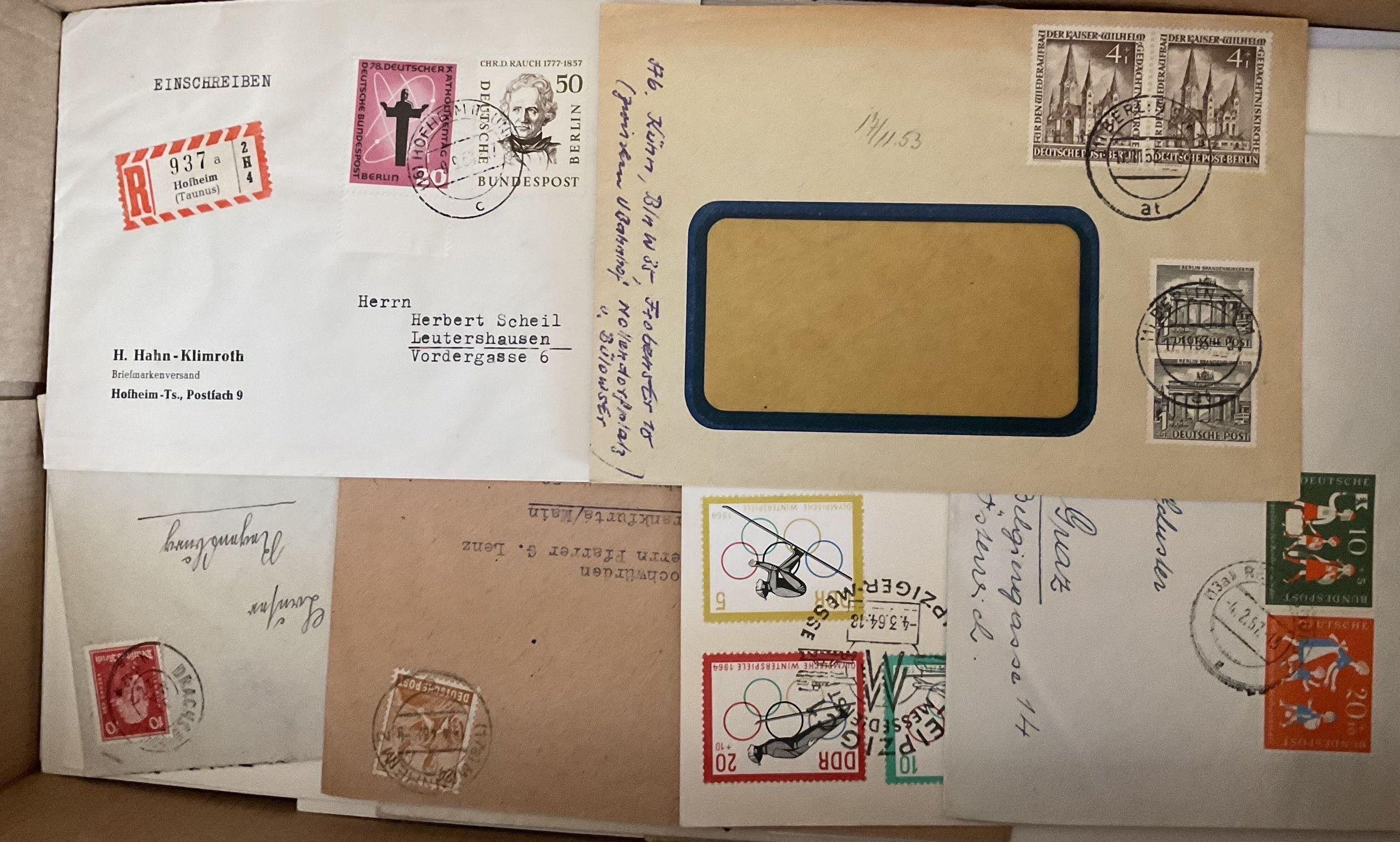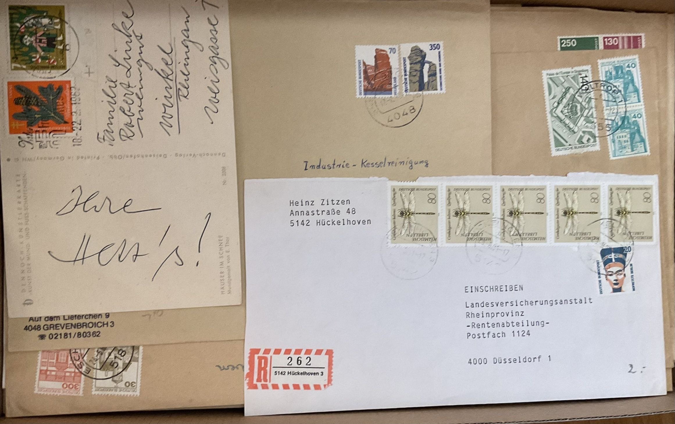 Ich habe verschiedene Restsammlungen von überwiegend deutschen Belegen zusammengepackt in einem Schuhkarton. Der ist nun prallvoll und ich biete ihn hier zum Verkauf an. Weit überwiegend Deutschland (wenig Ausland kann dabei sein), überwiegend Nachkriegszeit (wenig vor 1945 kann dabei sein), überwiegend Bund und Berlin (ein wenig DDR ist auch mit dabei). Überwiegend echt gelaufene Belege, dabei viele auch mit Zusatzleistungen (Einschreiben, Wertbriefe, Eilbriefe), ganz viele mit tollen „philatelistischen“ Frankaturen, aber auch Standardbriefe (Einzelfrankaturen von Sondermarken), viele besonders sauber gestempelt. Überwiegend 1960er bis 1990er Jahr (wenig aus den 1950er Jahren und ab 2000 kann auch mit dabei sein). Es sind viele sehr schöne, „bessere“ Belege dabei (wenn man berücksichtigt, was bei diesen Sammelgebieten und für den genannten Zeitraum "besser" ist).