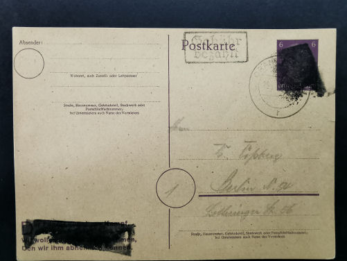 Ist es ein Beleg, der vor Mai 1945 aufgegeben wurde, dann müsste ja die Rückseite beschrieben sein. Und der Text sollte dann auf diese Zeit verweisen. Ansonsten waren in Berlin und Brandenburg keine Schwärzungen zugelassen.