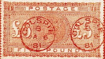 Ich konnte die Marke nur aus einem Auktionskatalog abbilden. Sie war schwarzweiß. Ich habe sie etwa in Photosuite verfärbt. Leider konnte ich die Abstempelung nicht in schwarz bringen. Photosuite besitzt keine "Layer" Möglichkeiten.