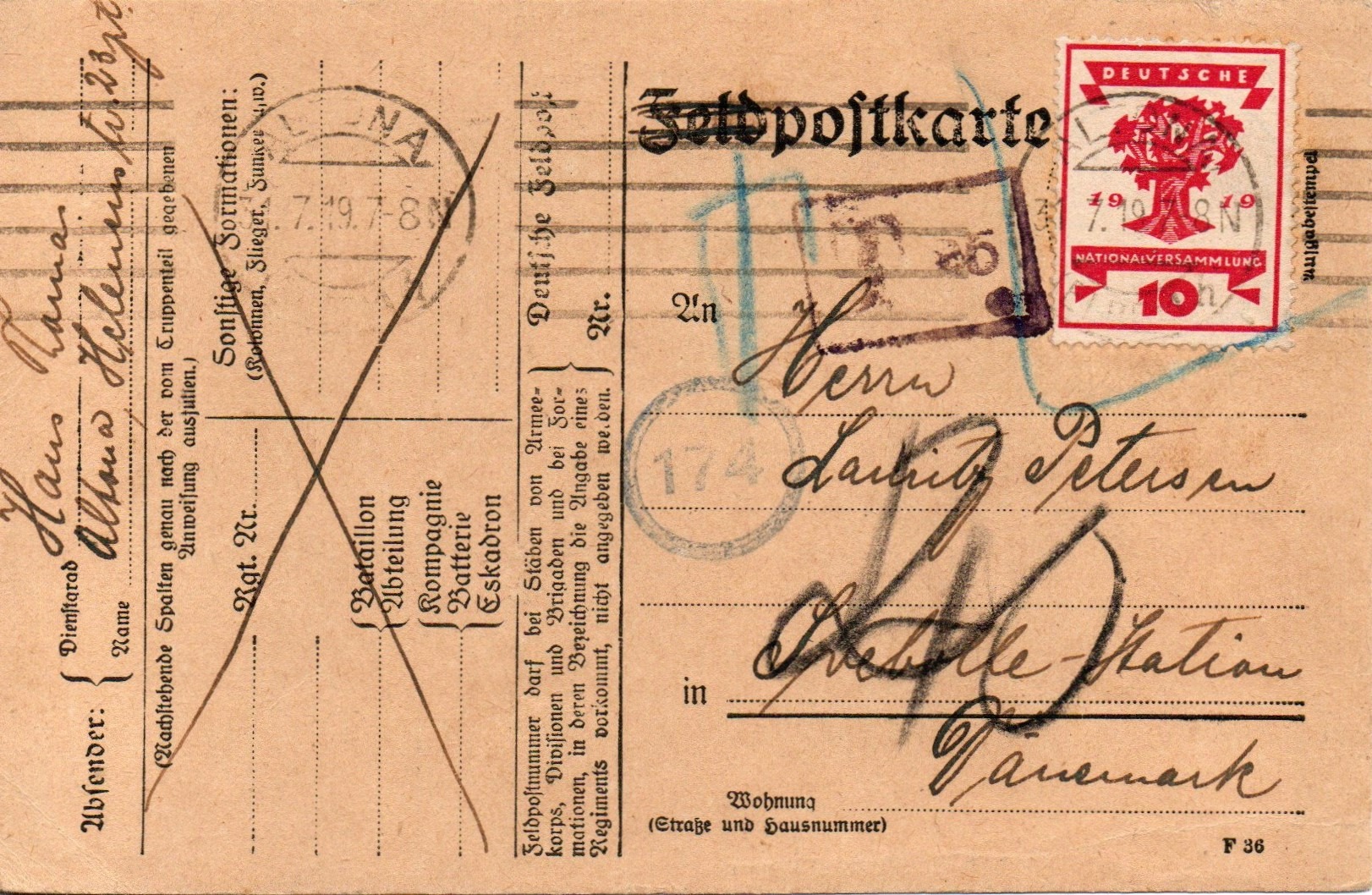 • DR 107, 10 Pfg. Eröffnung der Nationalversammlung, Postkarte nach DK mit Nachporto, 1919.jpg