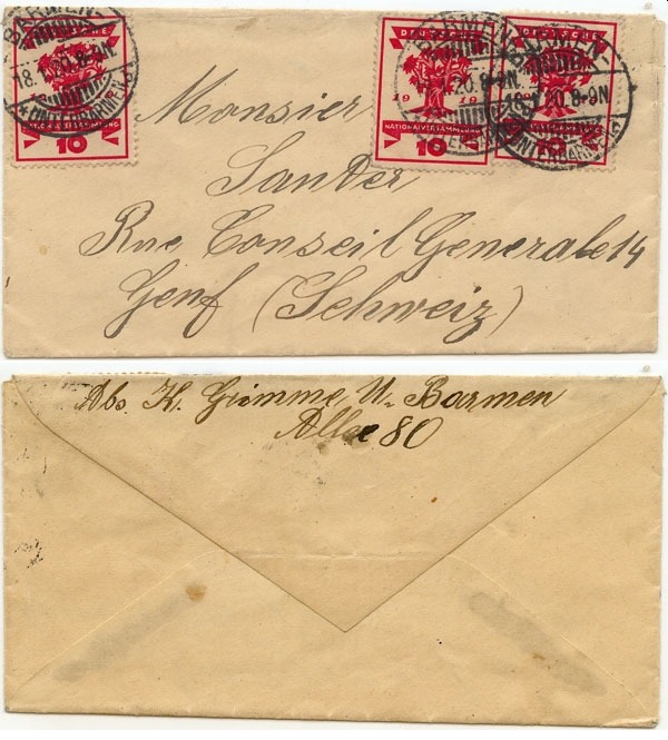 Abgestempelt in Barmen - Unterbarmen am 18.1.1920 und versendet nach Genf (Schweiz)