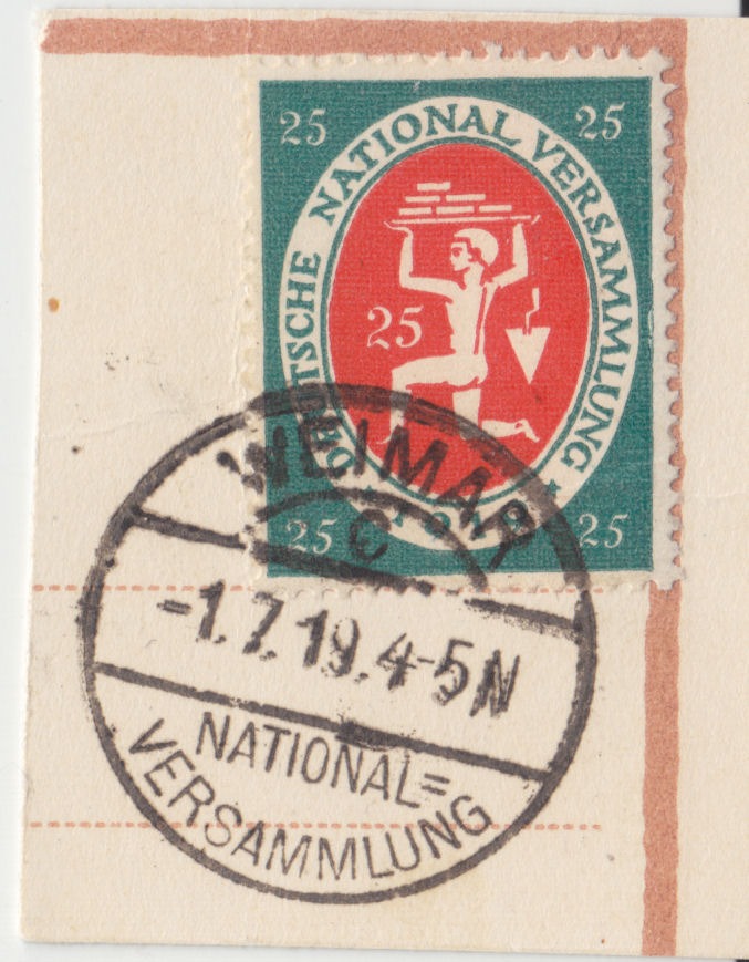 hier nun die letzte am 1.7.1919 herausgegebene Marke anlässlich der Eröffnung der Nationalversammlung, ein Wert zu 25 Pfennig bei dem es sich mir nicht erschließt warum diese Wertstufe ausgegeben wurde. Konsequenterweise wurde sie dann im Februar 1920 durch eine 30 Pfg. Marke ersetzt.