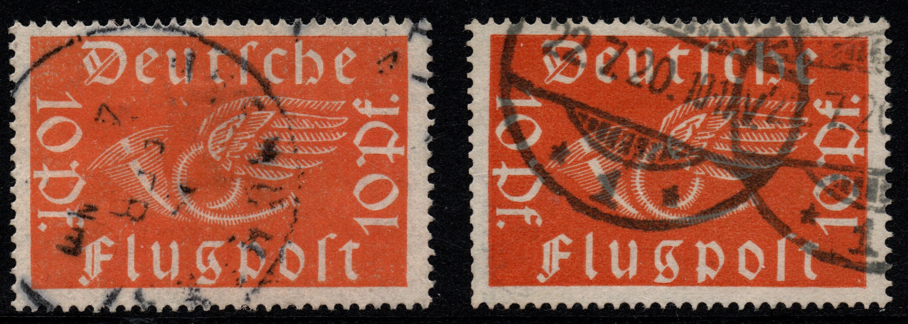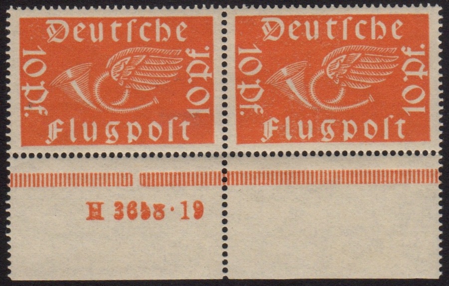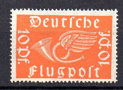 neue Woche, neue Briefmarkenausgabe. Heute beginne ich mit der zwei Werte umfassenden Flugpostausgabe aus dem Jahr 1919, zunächst der 10 Pfg. Wert. Im Kohl-Handbuch kann man einiges zu dieser Markenausgabe und den ersten Luftpostlinien nachlesen.