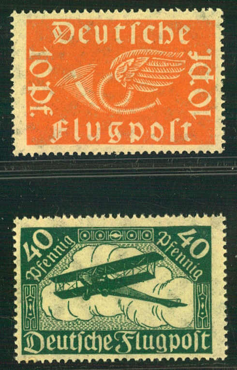 neue Woche, neue Briefmarkenausgabe. Heute beginne ich mit der zwei Werte umfassenden Flugpostausgabe aus dem Jahr 1919, zunächst der 10 Pfg. Wert. Im Kohl-Handbuch kann man einiges zu dieser Markenausgabe und den ersten Luftpostlinien nachlesen.