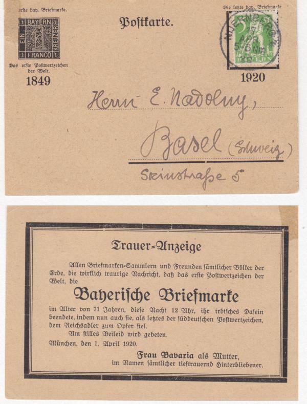 Die Marken wurden deshalb mir einem Überdruck Deutsches Reich versehen, um die Marken weiterhin nutzen zu können. Sie waren im ganzen Reichsgebiet postgültig wurden aber an die bayrischen Postämter verteilt, zudem waren sie am Berliner Sammlerschalter erwerbbar. Erstausgabetag 6. April 1920. Auflagenhöhe unbekannt, bis 30.9.23 frankaturgültig.