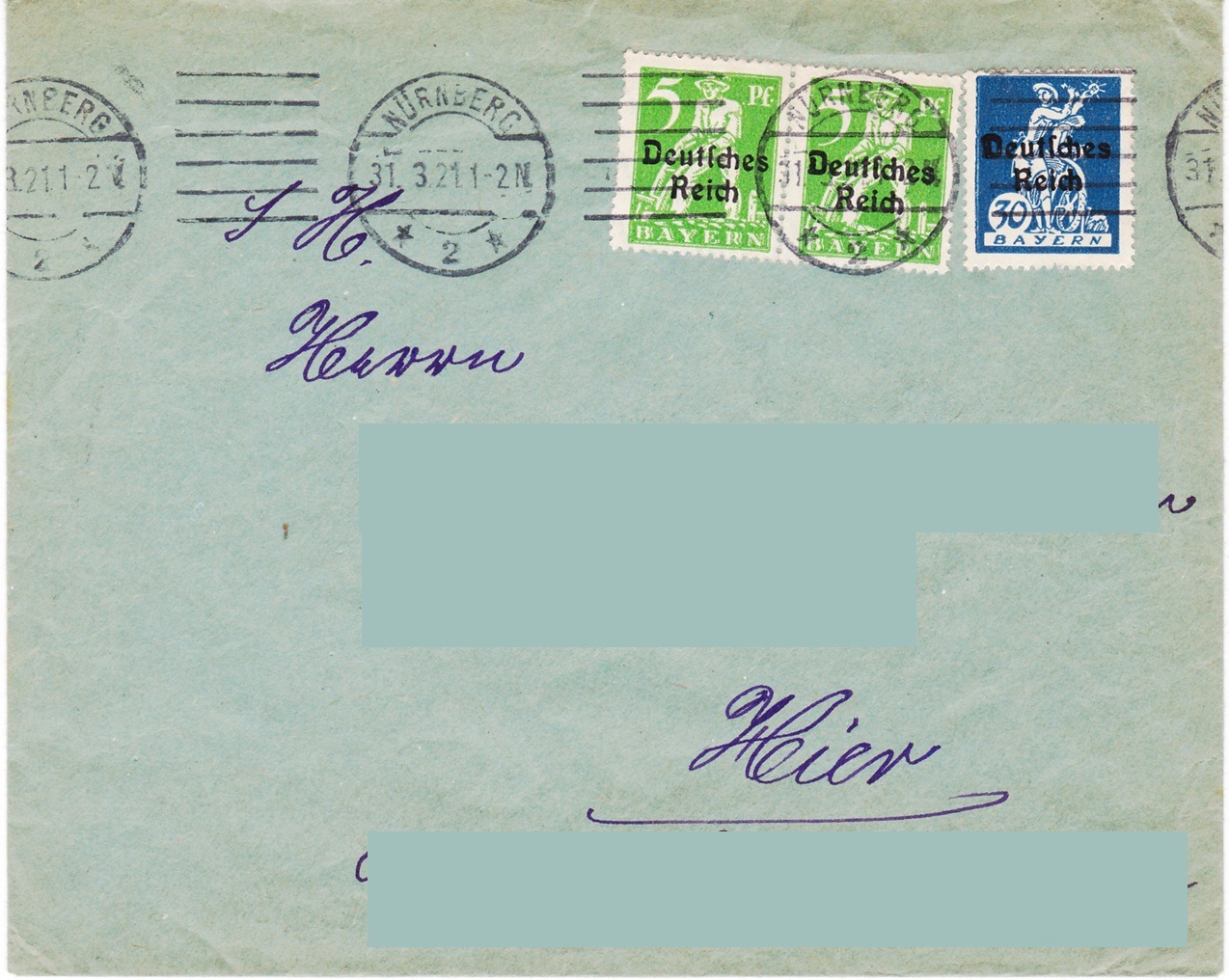 Dieser Beleg fällt somit in die Übergangszeit der bayerischen Post zur Reichspost (1.4.1920 - 30.6.1920).