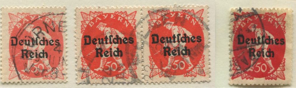 Ich zeige neben verschiedenen Farbtönen eine nicht geprüfte Marke mit einem nicht katalogisierten Aufdruckfehler und einem violetten Stempelteil, entweder ein Teilabschlag eines Posthilfsstellenstempels oder aber eines Formularstempel. Der Stempel ist nicht prüfbar.