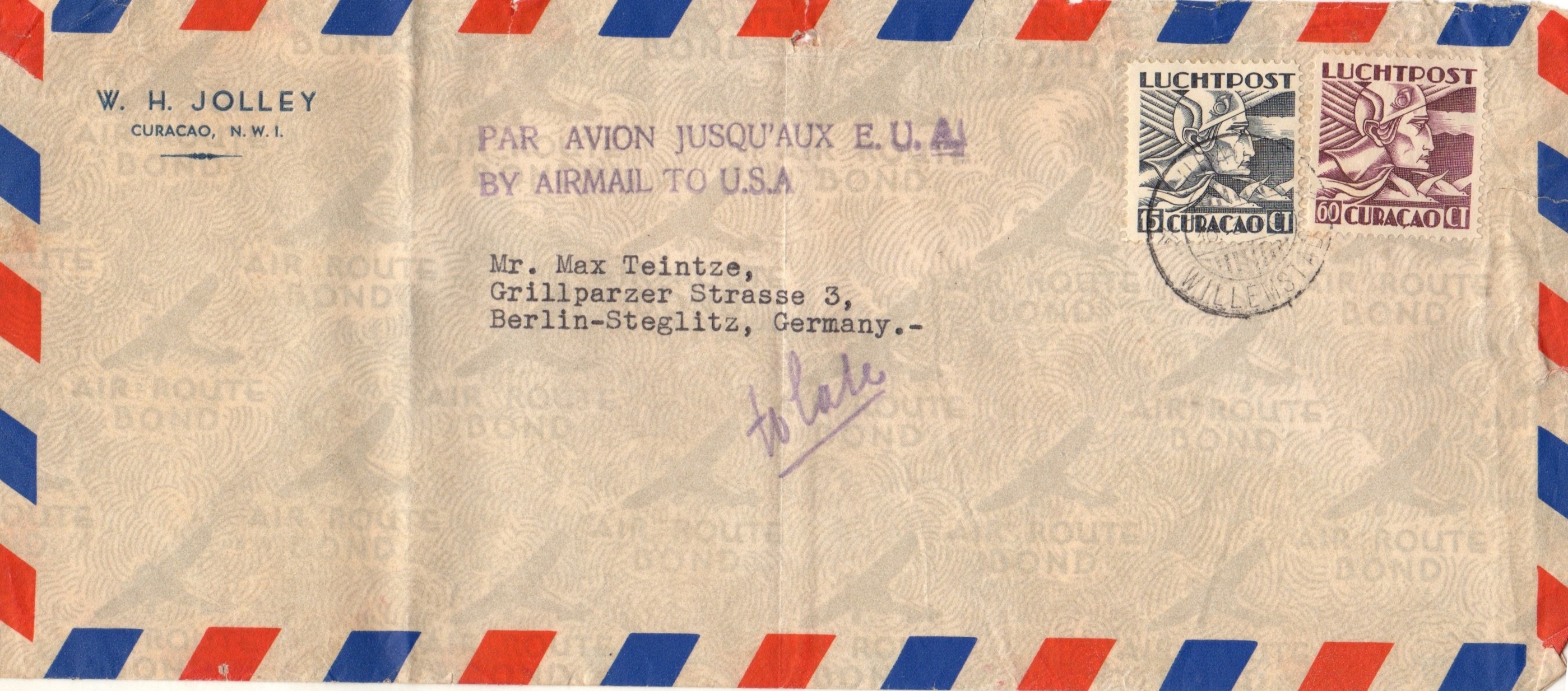 4. September 2024 um 11:38 #1 zeige hier zwei Luftpostbrief 1930 aus Willemstad , Curacao , 1938 nach Berlin.mit Nebenstempel zum Leitweg über USA