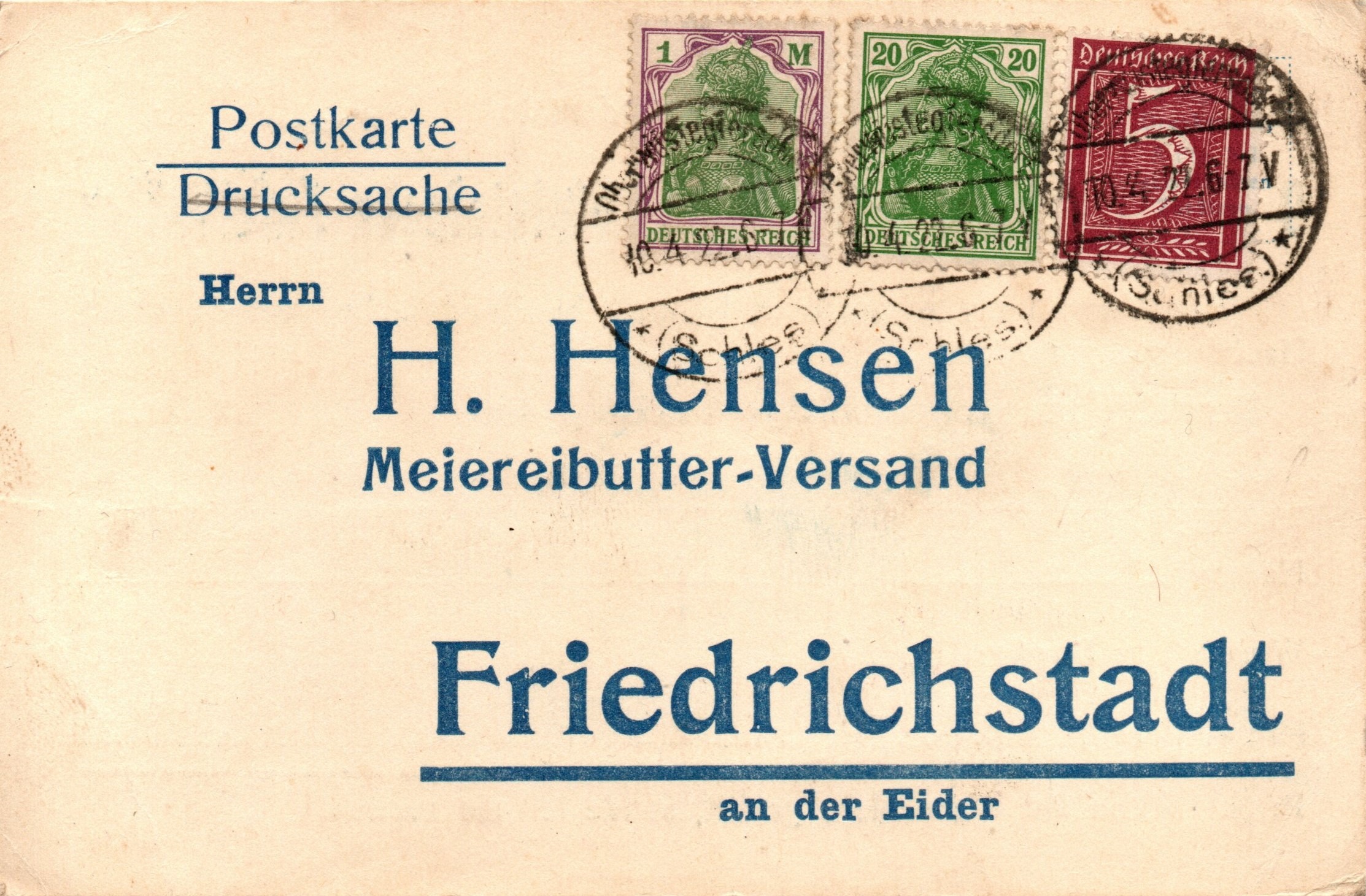 Aus meiner Kreis Waldenburg/Schlesien Sammlung eine Butterbestellkarte aus Oberwüstegiersdorf (Kleinschriftstempel) nach Friedrichstadt an der Eider. Ich habe irgendwo mal eine Abbildung eines Postkühlwagens für den Transport solcher Butterpakete gesehen, weiß leider nicht mehr wo.