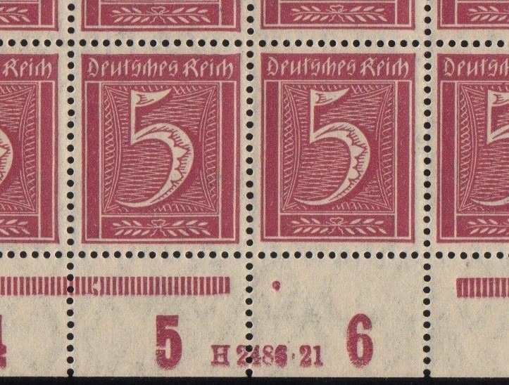 Hier also zwei gestempelte und inflageprüfte 5 Pfg. Marken mit unterschiedlichen Farbtönen, eine postfrische Marke vom Oberrand mit dem für den Plattendruck charakteristischen Reihenwertzähler sowie ein postfrisches Paar vom Bogenunterrand mit der HAN-Nr. H 2486.1. Gestempelt bzw. auf Beleg ist so etwas schon deutlich gesuchter.