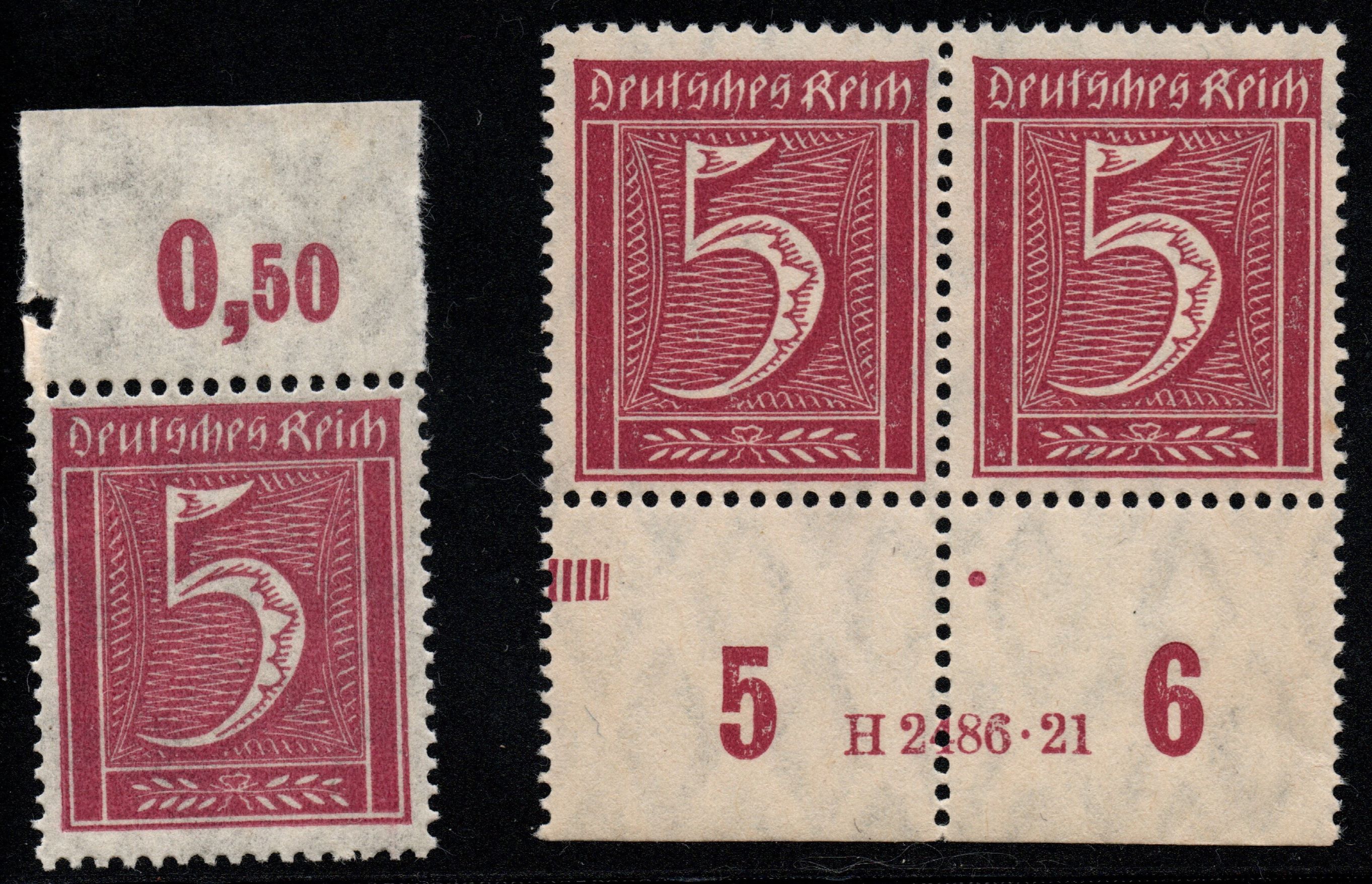 Hier also zwei gestempelte und inflageprüfte 5 Pfg. Marken mit unterschiedlichen Farbtönen, eine postfrische Marke vom Oberrand mit dem für den Plattendruck charakteristischen Reihenwertzähler sowie ein postfrisches Paar vom Bogenunterrand mit der HAN-Nr. H 2486.1. Gestempelt bzw. auf Beleg ist so etwas schon deutlich gesuchter.