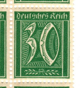 Das finde ich hochinteressant. Ich habe vor kurzem recht günstig einen Posten Inflabögen der Ziffern- und Arbeiterausgabe Wz. 1 in der Bucht erwerben können. Darunter zwei Bögen der 30 Pfg. Marke.