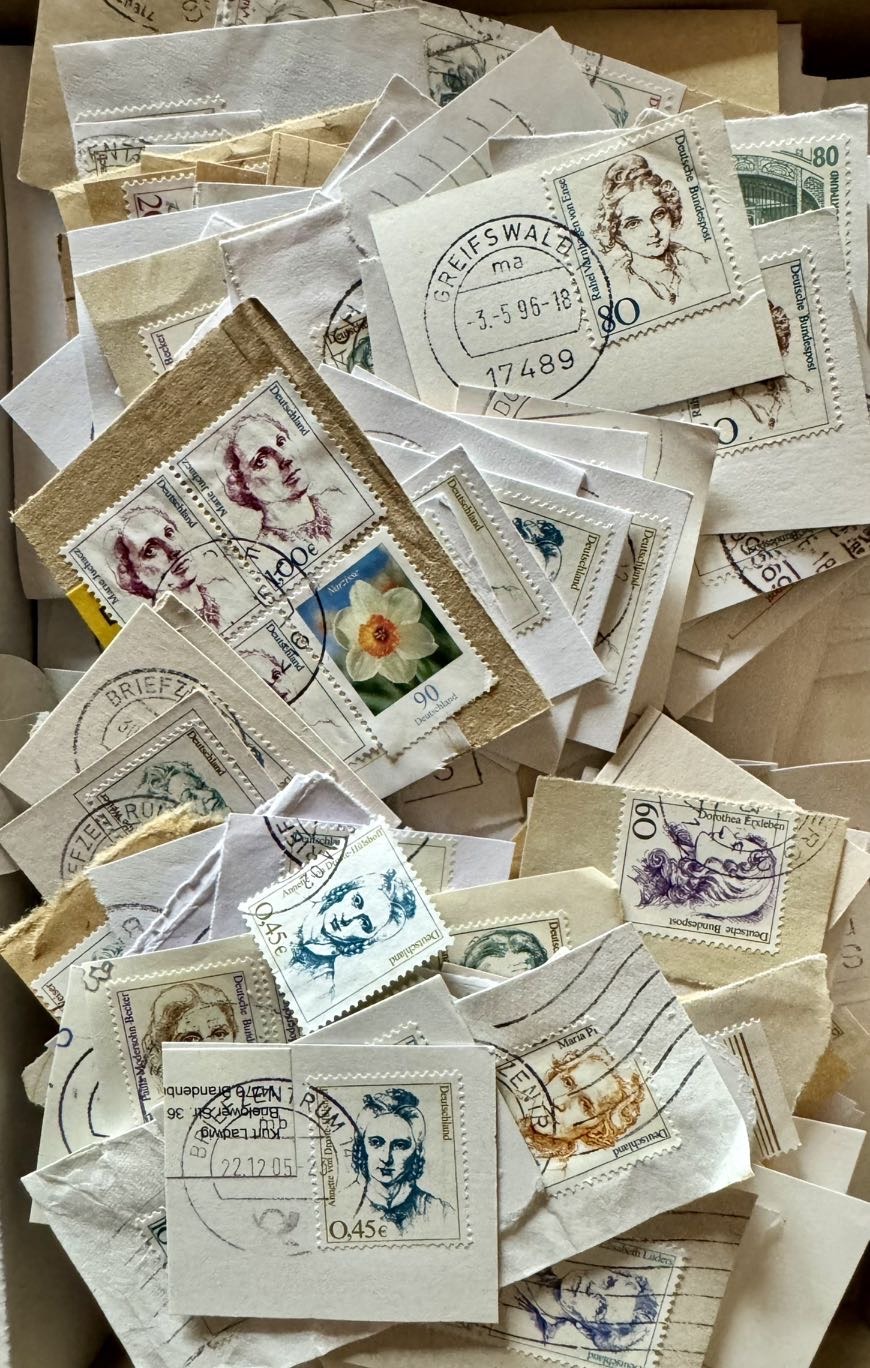 Ich biete eine kleine Kiste voll mit Kiloware der Dauerserien „Frauen“ (ca. 150 Gramm), „Sehenswürdigkeiten“ (ca. 100 Gramm), „Industrie und Technik“ sowie „Burgen und Schlösser“ (insgesamt ca. 50 Gramm).