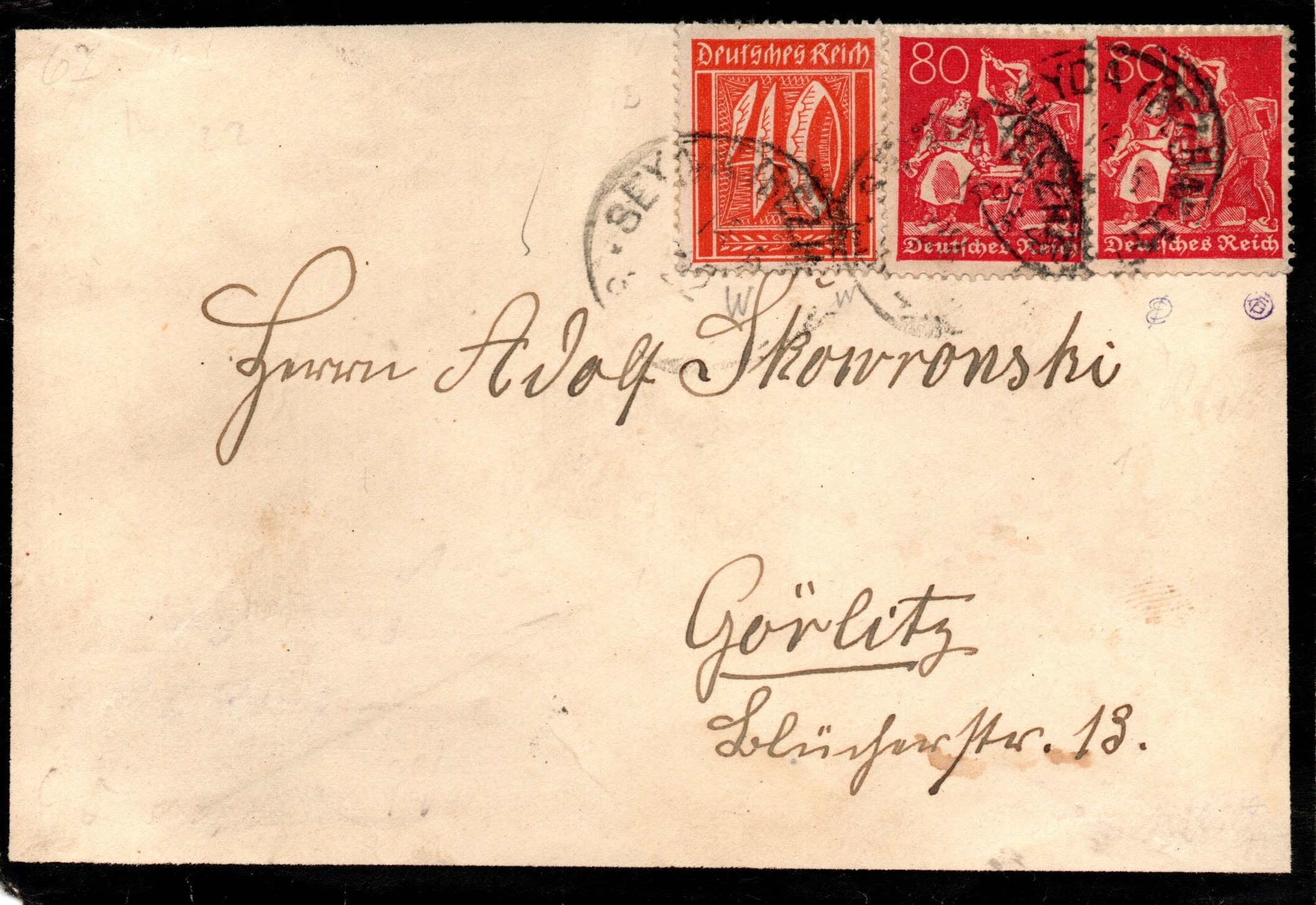 Hier ein Trauerbrief aus Seyda nach Görlitz vom 15.5.22, also PP7. Mit zwei 80 Pfg. Marken Arbeiterausgabe Wz.1 und einer 40 Pfg. Ziffernausgabe Wz. 2 portorichtig frankiert. Porto Inlandsbrief PP7 = 200 Pfg.