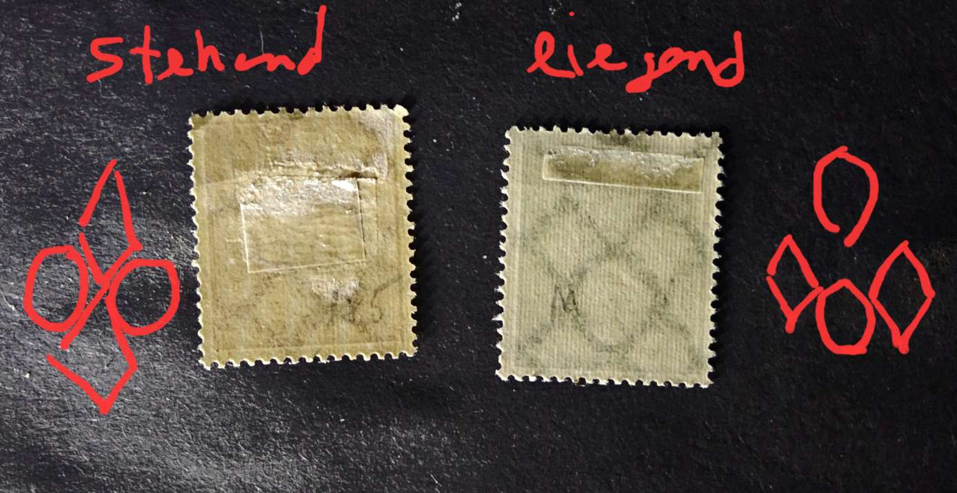 Nun noch mal zu Wz. Waffeln: Die konvexen und konkaven Bestandteile desselben wechsel sich in beiden Lagen regelmäßig ab, da gibt es kein Innen und Außen. Welchen Ausschnitt des Netzes man auf einer Briefmarke sieht, hängt vom Papierzuschnitt und der Markenpositon im Bogen ab. Entscheidend für die Lagebestimmung des Wasserzeichens ist das Längenverhältnis: Das Markenbild stehe aufrecht. Erscheinen dann die Wasserzeichenelemente höher als breit, ist es ein stehendes Wasserzeichen. Sind sie breiter als hoch, ist es ein liegendes. Jetzt klar?