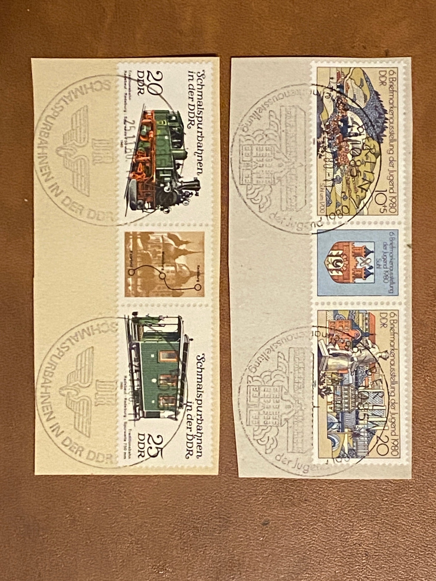 Hallo Kenner der Briefmarken-Zunft, von einem Tauschfreund bekam ich zwei prall gefüllte dünne Alben mit den abgebildeten DDR-Marken mit Sonderstempeln, aus denen ich mich bedienen dürfe. Auf mein Befremden hin erzählte er mir, daß man sich damals in der DDR mit den auf Zettelchen aufgeklebte Marken beim Postamt Sonderstempelungen holen konnte. Wie gehe ich nun damit um? Gibt es in der Community Kenner der damaligen Szene? Die Zettelchen sind keineswegs ausgeschnittene Ganzsachen aus Briefumschlägen oder Postkarten. Haben die als Sammelobjekte einen Eigenwert? Oder sollte ich sie ablösen und einordnen? Ich bin einigermaßen hilflos. Für Eure kompetente Hilfe danke ich im Voraus. LG, Sanjoroikkaku