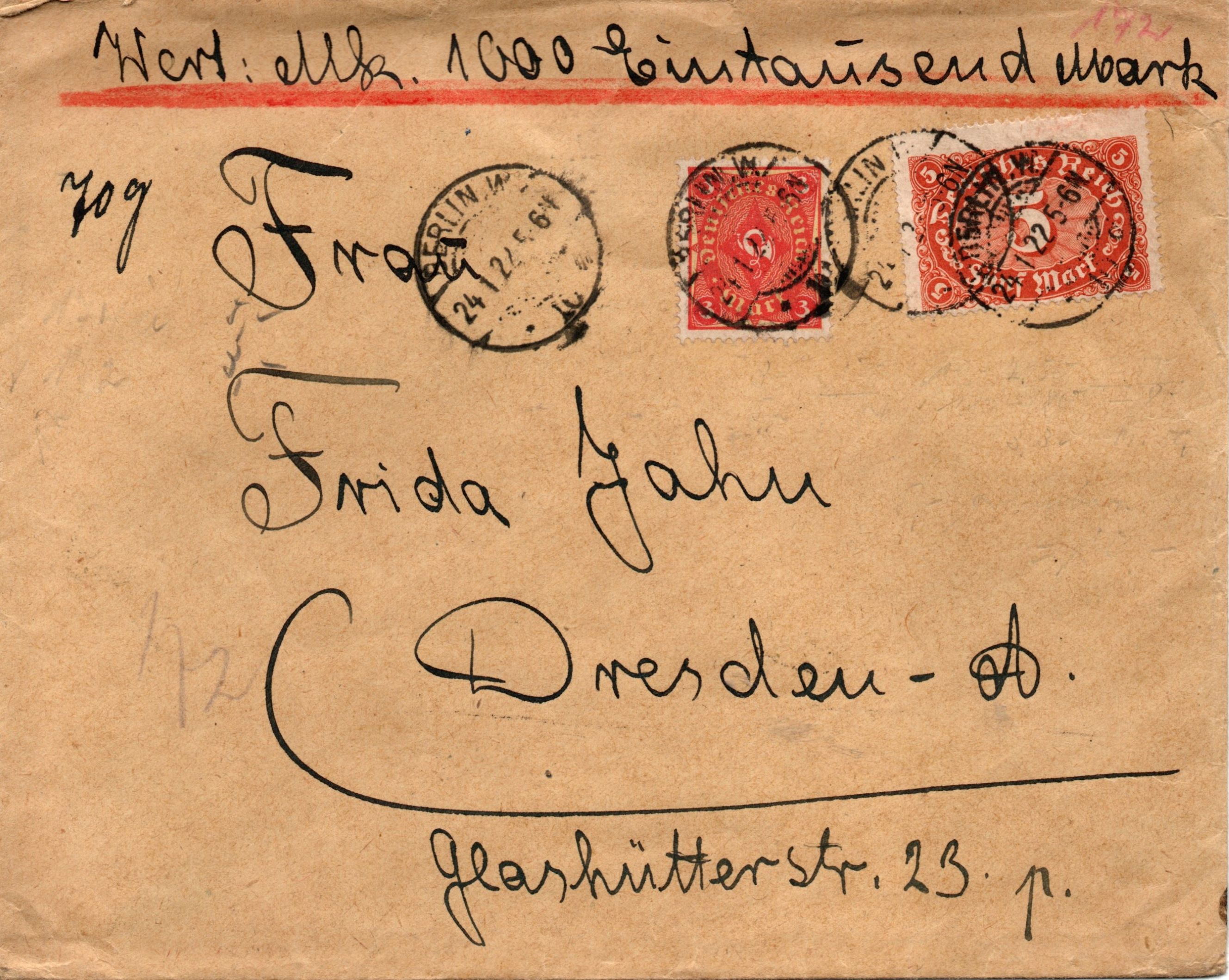 Beginnen möchte ich mit dem 5 Mark Wert Ziffern im Queroval Wz.1 Rauten, Der Entwurf stammt von Hermann Haas aus München. Die Marken wurden im Plattendruck ausschließlich in Bogenform produziert. Das Kohl Handbuch befasst sich sehr ausführlich mit dem Druckverfahren und geht von waagerechten Schalterdruckpaaren aus. Zwischenstegpaare sind aber nicht bekannt. Die Marken kamen im September 1921 an die Postschalter, die Auflagenhöhe ist nicht bekannt. https://www.philadb.com/?site=list&catid=&catuid=484&id=516