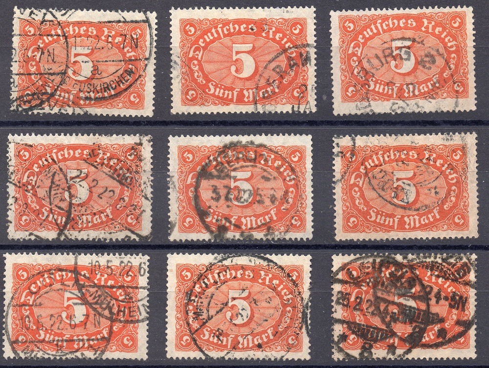 Beginnen möchte ich mit dem 5 Mark Wert Ziffern im Queroval Wz.1 Rauten, Der Entwurf stammt von Hermann Haas aus München. Die Marken wurden im Plattendruck ausschließlich in Bogenform produziert. Das Kohl Handbuch befasst sich sehr ausführlich mit dem Druckverfahren und geht von waagerechten Schalterdruckpaaren aus. Zwischenstegpaare sind aber nicht bekannt. Die Marken kamen im September 1921 an die Postschalter, die Auflagenhöhe ist nicht bekannt. https://www.philadb.com/?site=list&catid=&catuid=484&id=516