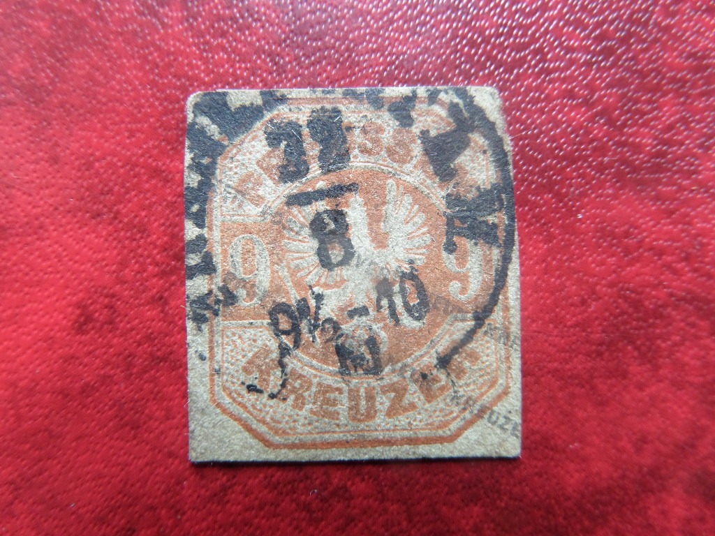 ich hab gestern eine Marke entdeckt ,die einen kleinen 2 zeiligen schräg von 4 zu10 Uhr verlaufenden Aufdruck hat .Ich kann ´Post´ und ´neun Kreuzer ´ entziffern.Weiss jemand näheres zu dieser Marke?