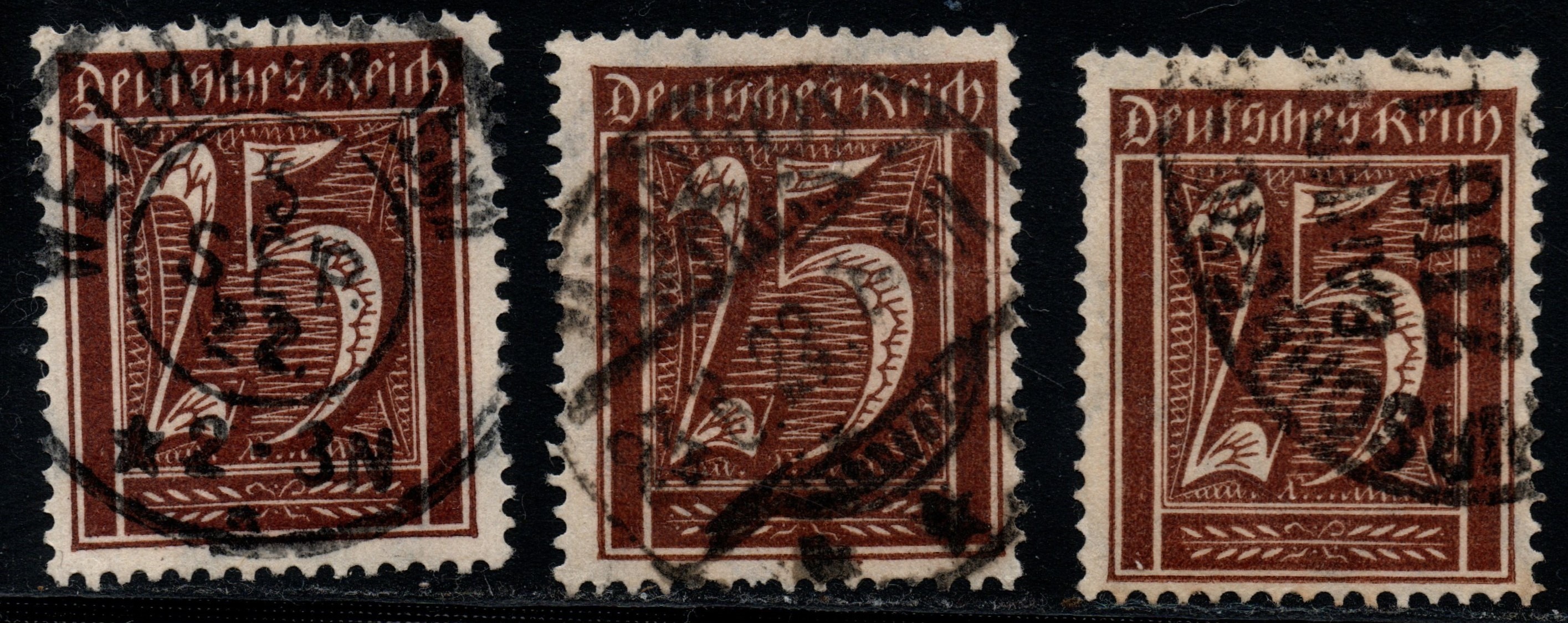 Druckabweichungen werden nicht genannt. Auf die Verwendung auf Beleg gehe ich in einem eigenen Beitrag ein. Hier zeige ich drei gestempelte und inflageprüfte Marken mit leicht unterschiedlichen Farbtönen.