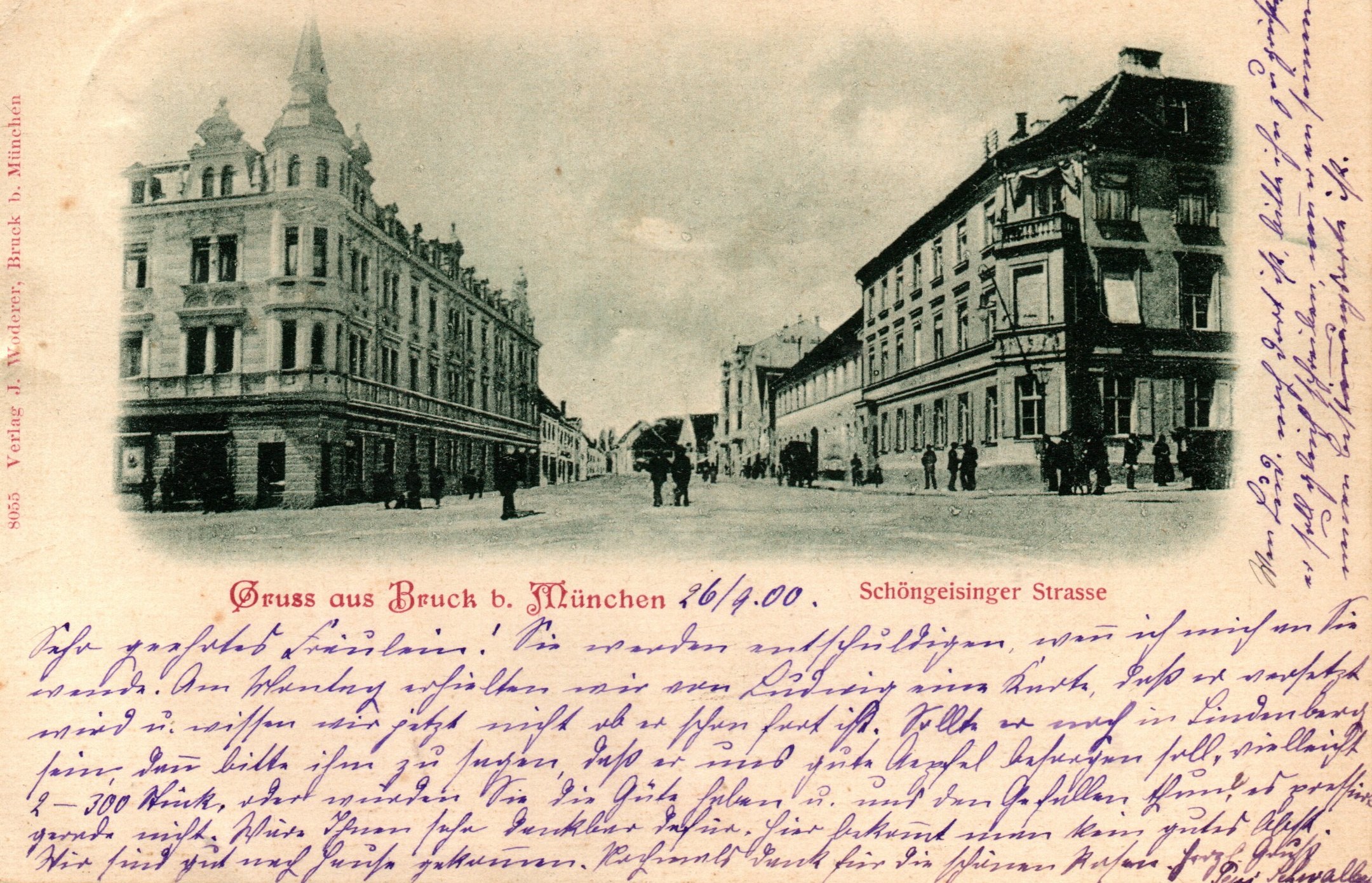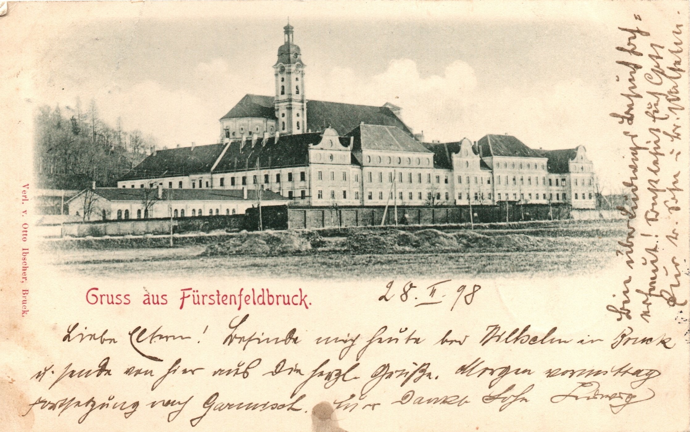 Den Anfang macht eine Ansicht aus der Kreisstadt, damals noch Bruck. So heisst die Stadt auch heute noch in der Bevölkerung. Das Kloster Fürstenfeld, nach der Säkularisierung auf verschiedene Weise genutzt. Heute Museum, Veranstaltungsort und Hochschule für den Öffentlichen Dienst in Bayern, wurde 1908 offiziell ein Teil des Namens der Stadt, wie schon geschrieben heisst die Stadt umgangssprachlich immer noch Bruck, ist ja auch viel kürzer.