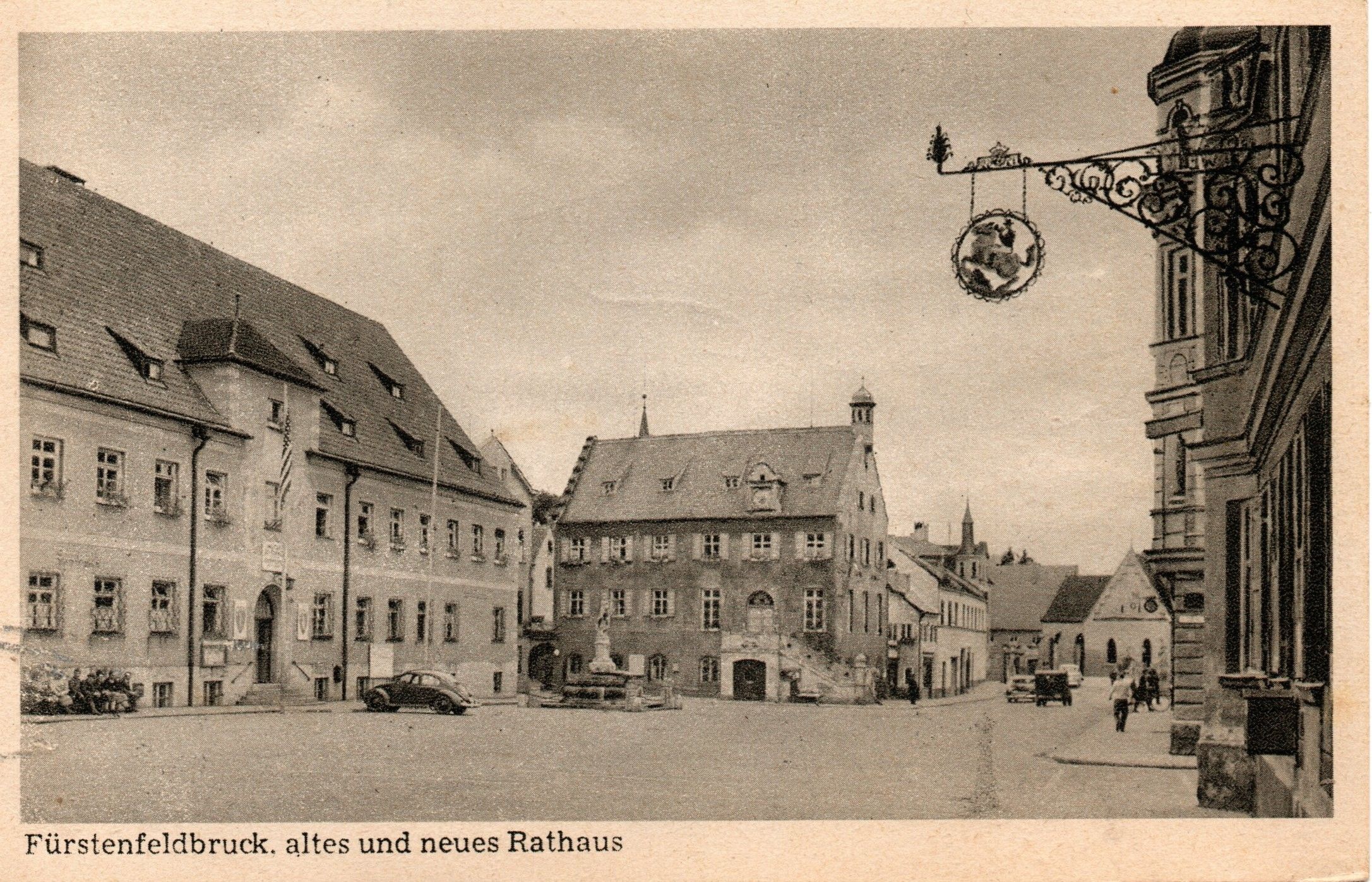 Die Karte ist 1949 gelaufen und die Aufnahme ist sicherlich auch kurz nach dem Krieg entstanden. Vor dem neuen Rathaus hängt die US-Fahne. Möglicherweise diente das neue Rathaus als Standortkommandantur denn den Fliegerhorst Fürstenfeldbruck hatten nach dem Krieg die Amerikaner übernommen, auch als "Fursty" bekannt.