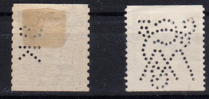 Bei den schwedischen Lochungen hätte wir einmal die S18 (Skandinav. Kredit AB, Stockholm), die sich nur marginal von der S19 (Sieverts Kabelverk AB, Sundbyberg) unterscheidet, aber aufgrund des Stempelfragments ST wohl "Stockholm" zuzuordnen ist.