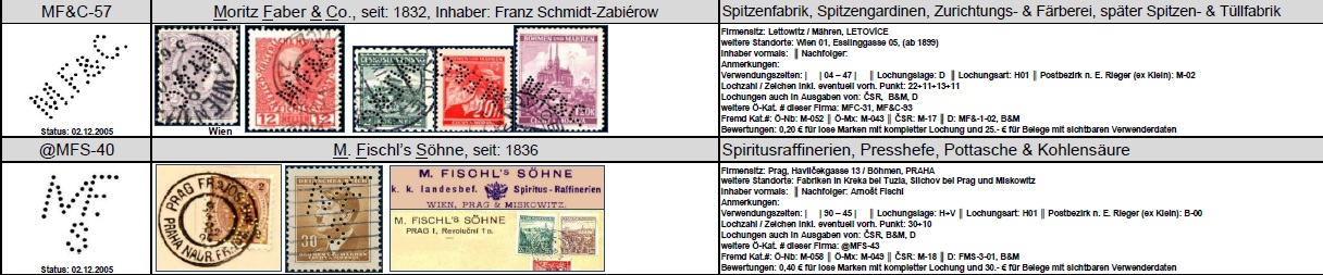 Wer Perfins bei tschechischen Briefmarken identifizieren möchte, kann hier mal eine Ausstellungssammlung durchblättern, die eine Menge dieser Lochungen zeigt mit Erklärung über die Bedeutung: