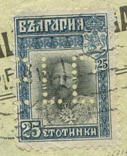 Den Anfang macht eine Marke mit der Lochung (kyrill.) BNB = Balgarska Narodna Banka. Siehe Online-Perfin Katalog der Link-Liste. Vorder- und rückseitig eingescannt. Die Rückseite hochkant.