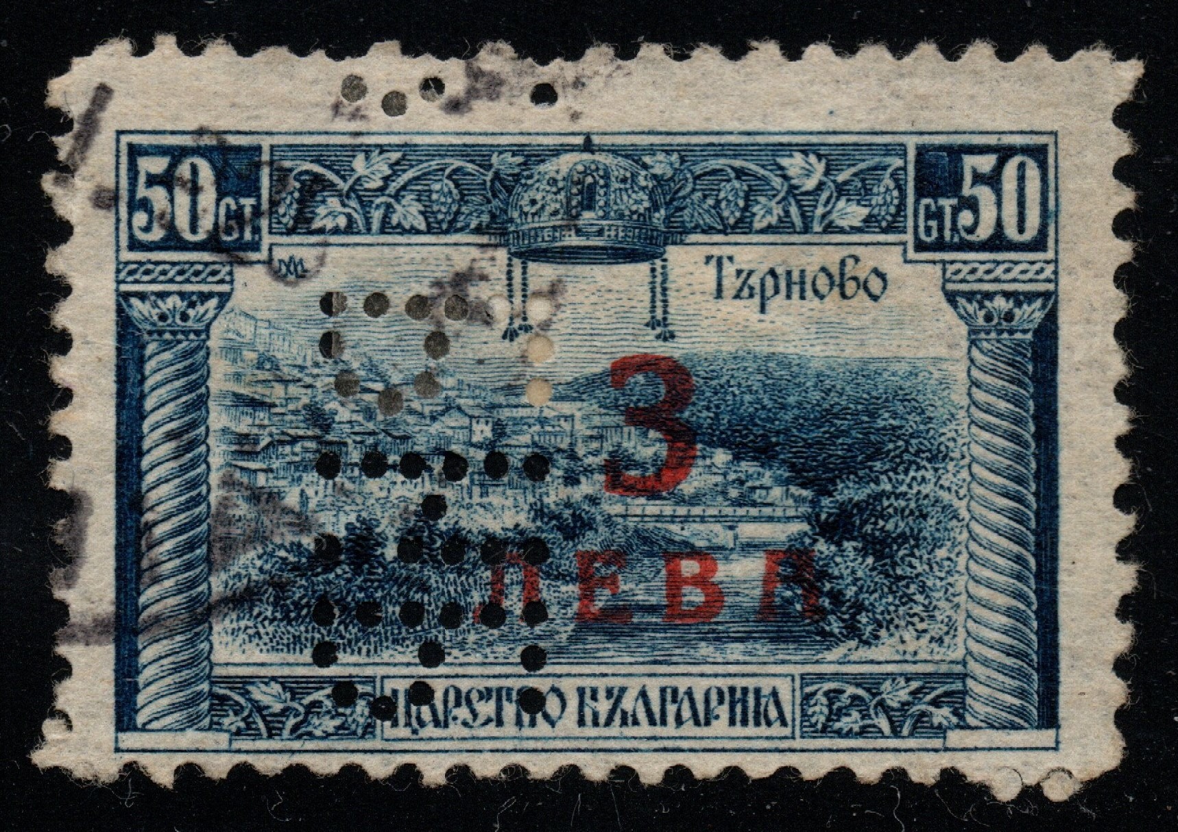 Den Anfang macht eine Marke mit der Lochung (kyrill.) BNB = Balgarska Narodna Banka. Siehe Online-Perfin Katalog der Link-Liste. Vorder- und rückseitig eingescannt. Die Rückseite hochkant.