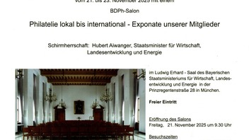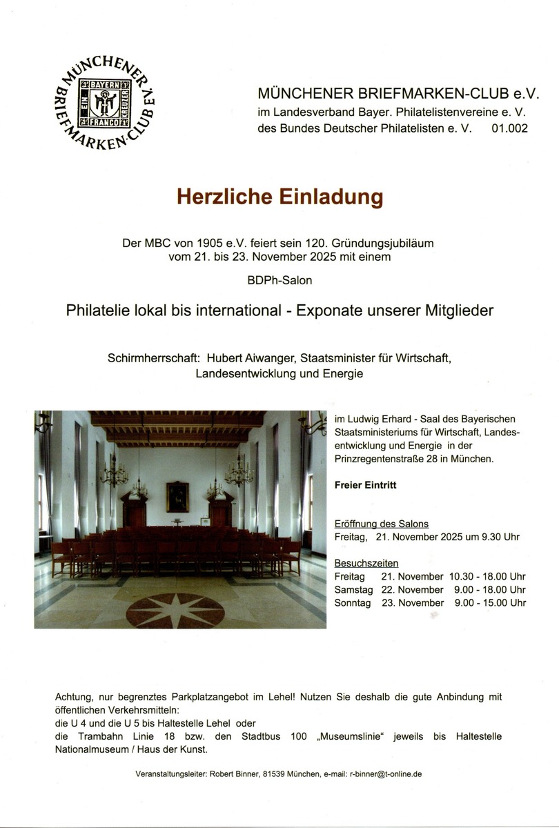 nun ist es offiziell. Der Münchner Briefmarken Club e.V. feiert sein 120. Gründungsjubiläum mit einem BDPH Salon vom 21. 11. bis 23.11.2025.