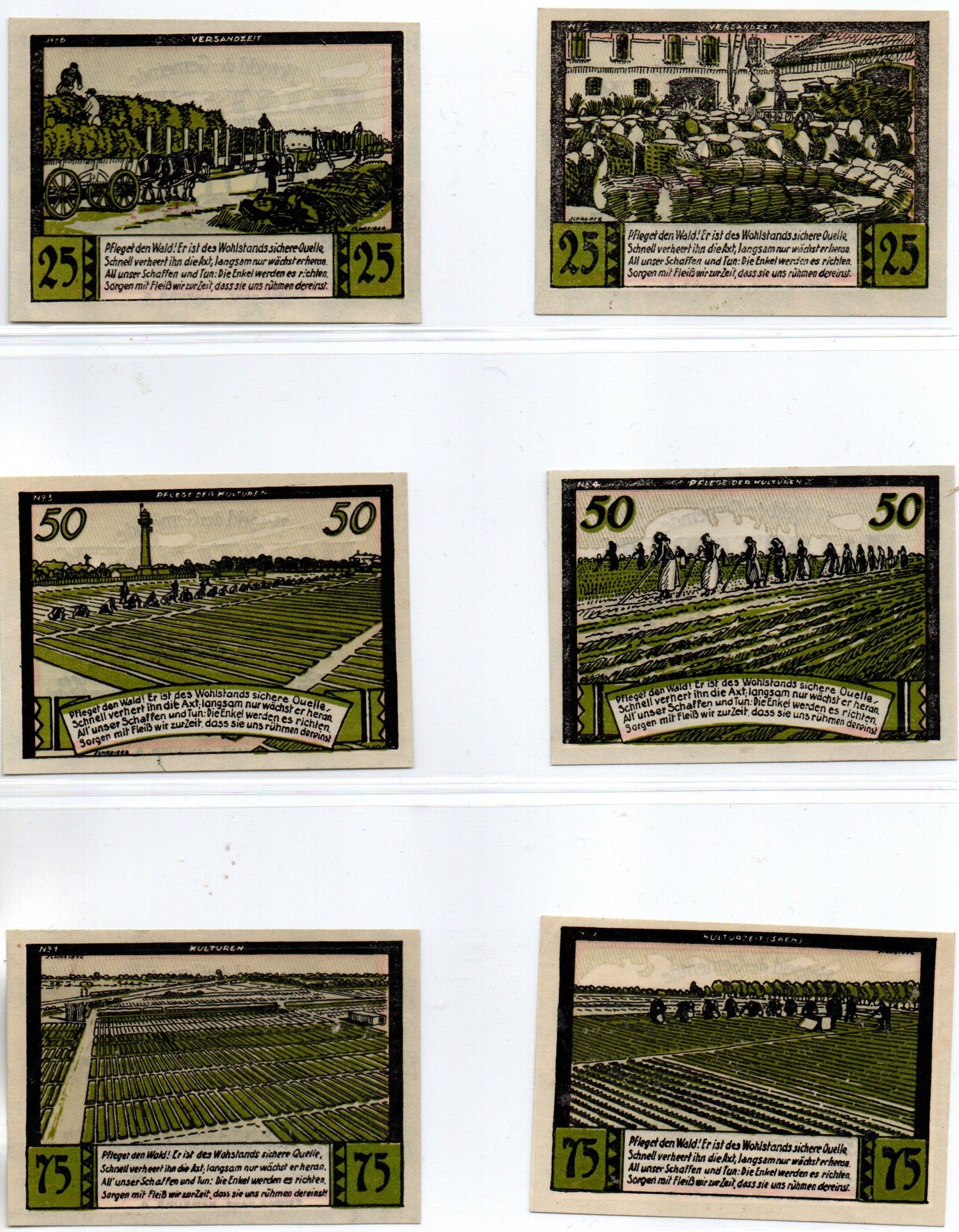 die damals noch eigenständige Gemeinde Egenbüttel im Kreis Pinneberg beteiligte sich im Jahr 1921 zum Wohl der klammen Gemeindekasse mit einer aus sechs Scheinen bestehenden Serienscheinausgabe an der damaligen Notgeldausgabenflut. Die Ausgabe besteht aus je zwei 25, 50 und 75 Pfg. Scheinen. Rückseitig sieht man verschiedene lokale Motive. Drei davon zeigen Bilder rund um den Schießstand aber Schützenvereine und Schützenfeste spielen besonders im südlichen Schleswig Holstein eine große Rolle. Egenbüttel ist seit 1973 ein Teil der Gemeinde Rellingen.